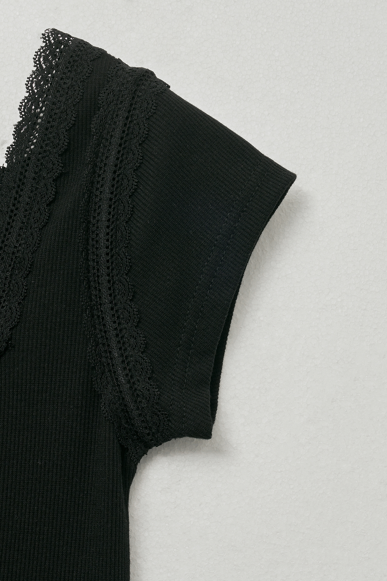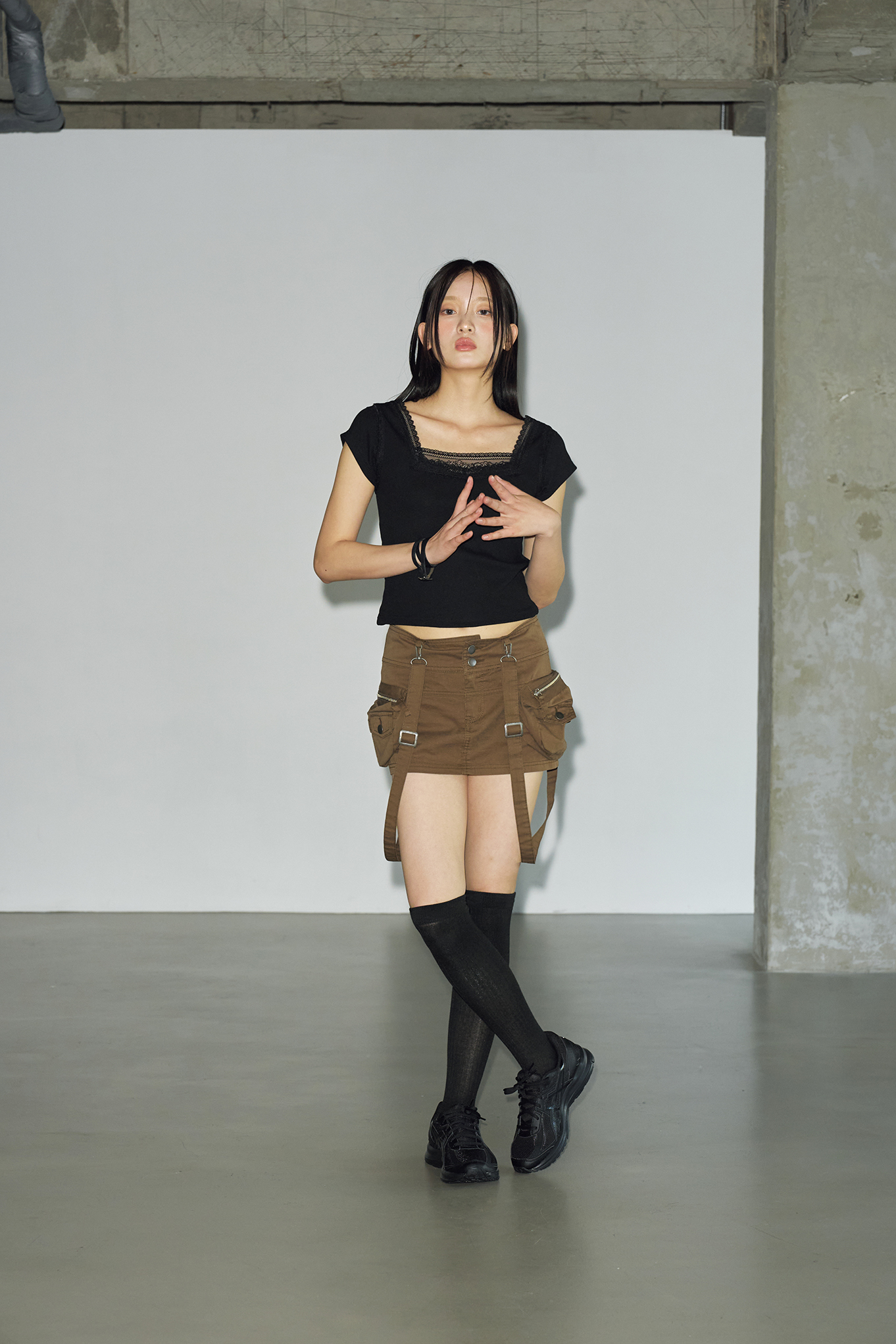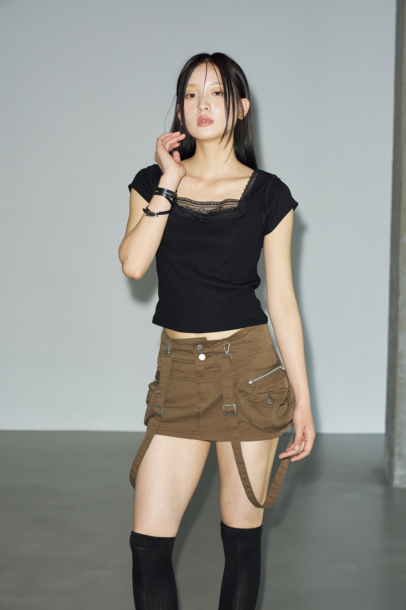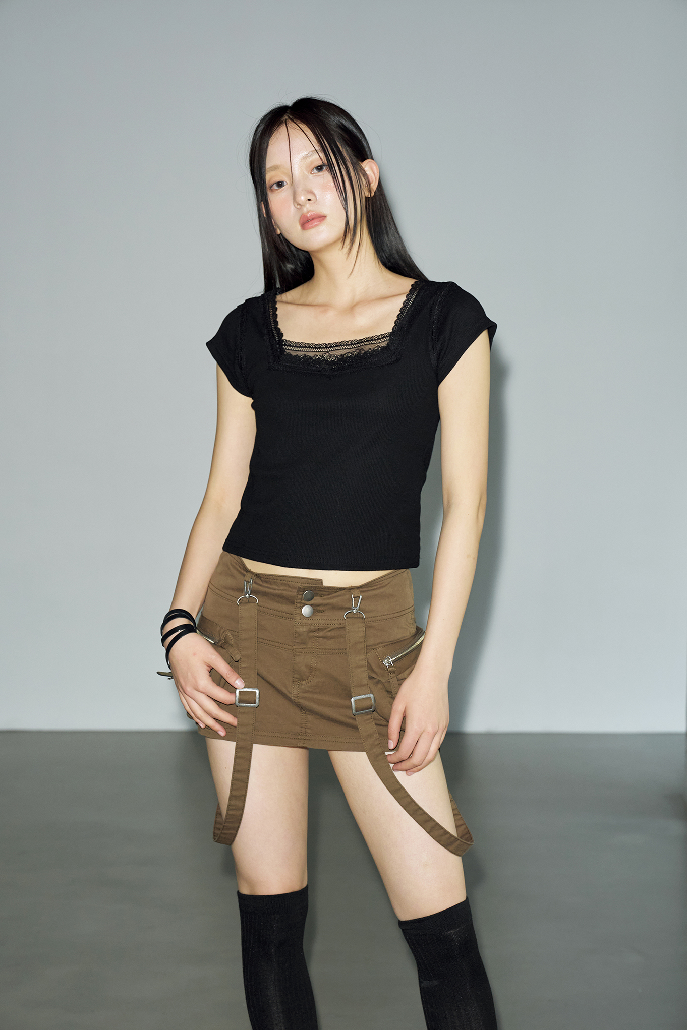 - 스퀘어 넥 디자인에 레이스 디테일로 세련된 분위기를 더한 크롭 티셔츠입니다.