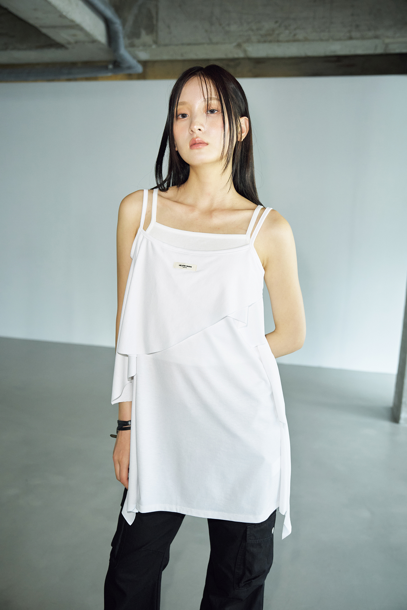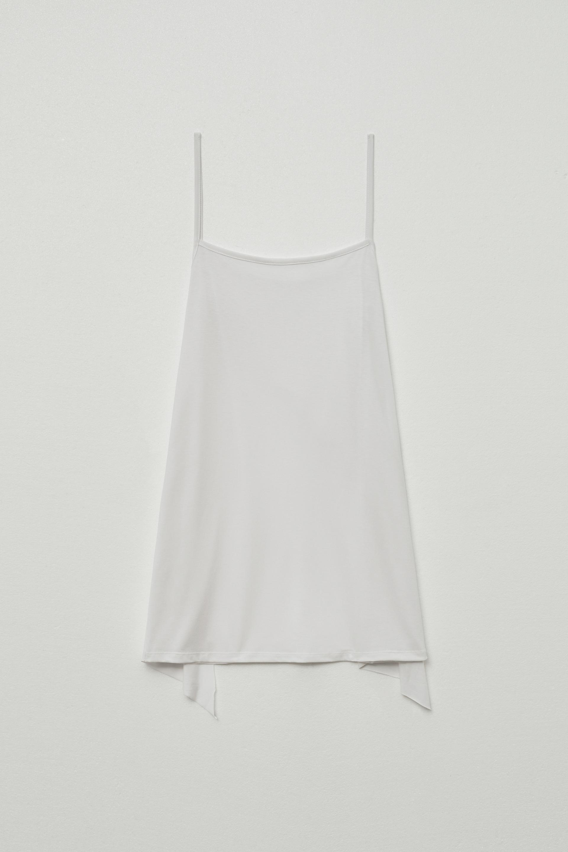 - 비대칭 절개 라인으로 유니크한 실루엣을 연출하는 슬리브리스 드레스입니다.