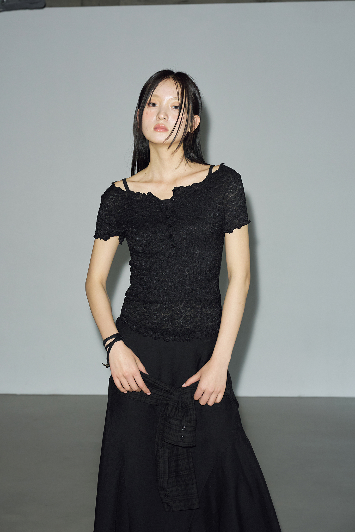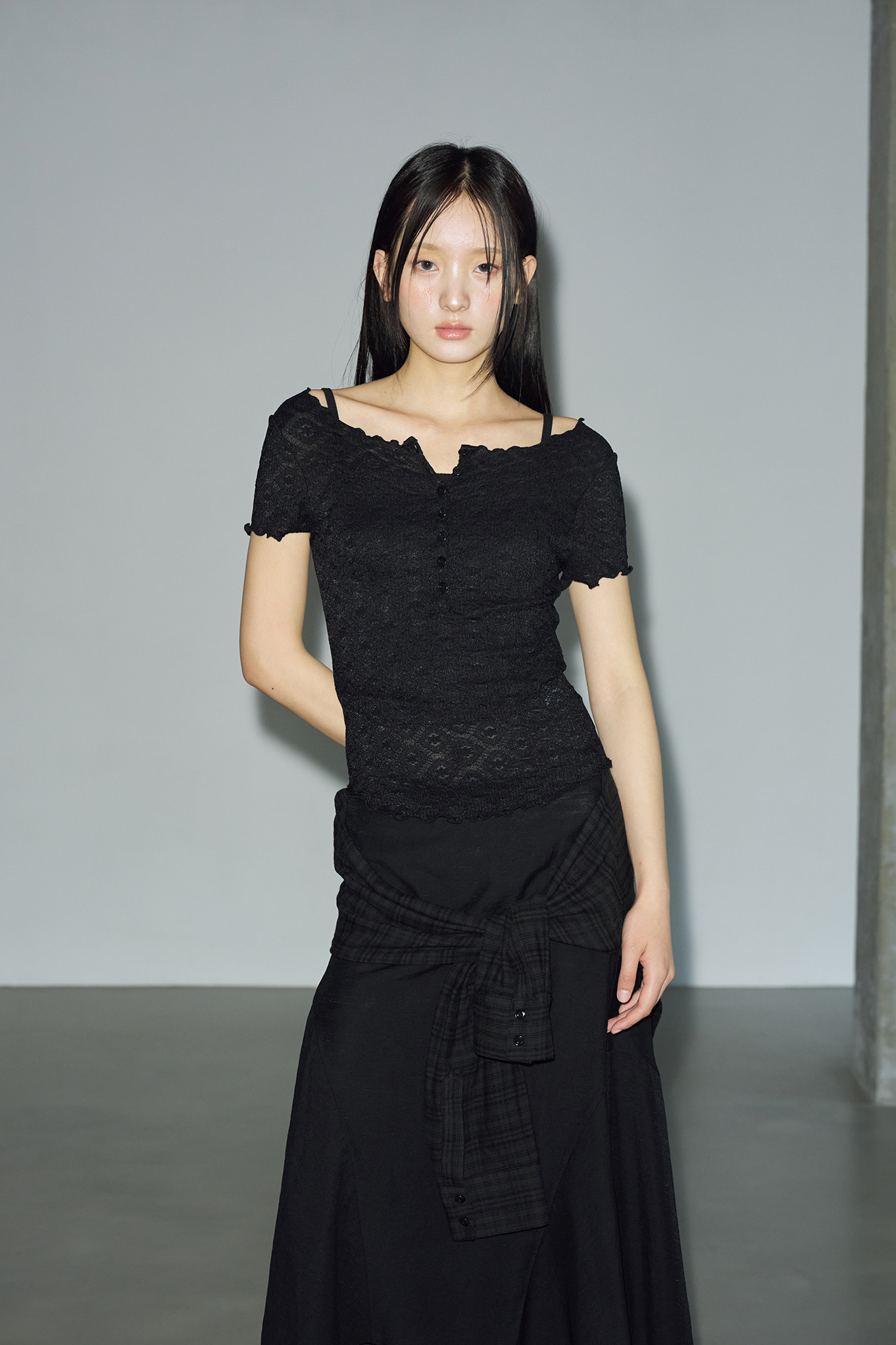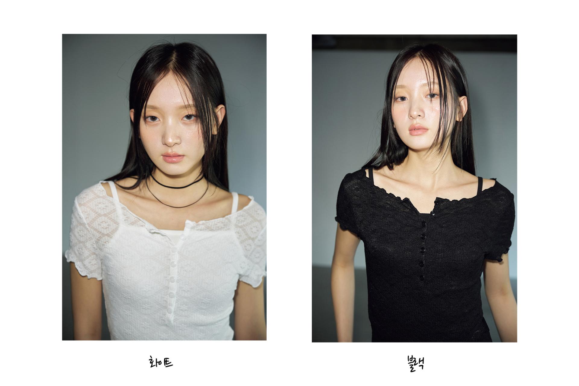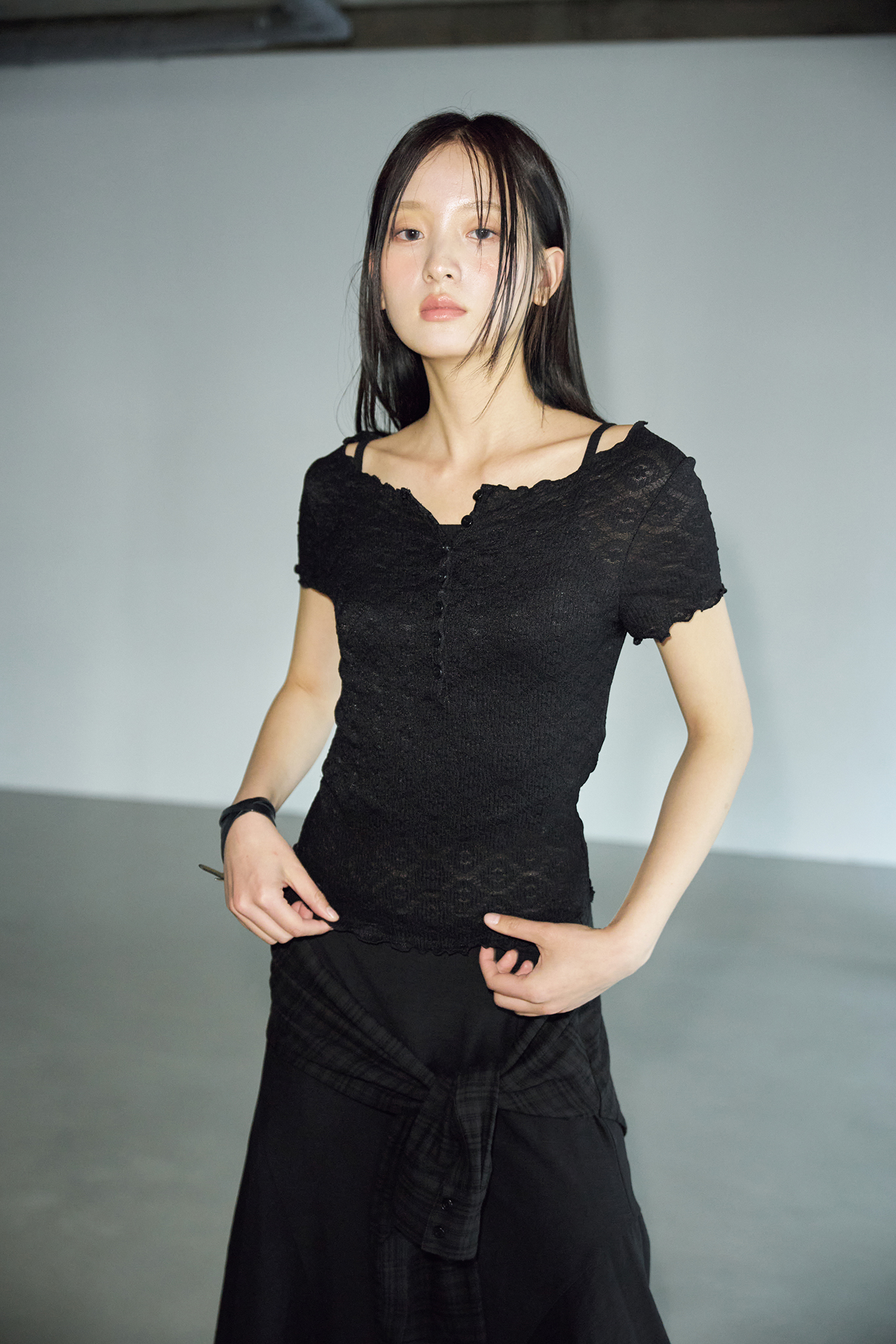 - 살이 비치는 매력의 시스루 레이스 패브릭으로 제작되어, 단품 착용이나 이너 레이어링 등 활용도가 높습니다.