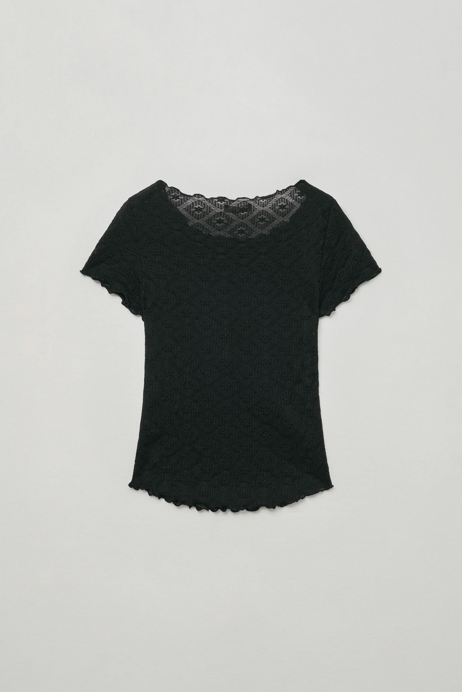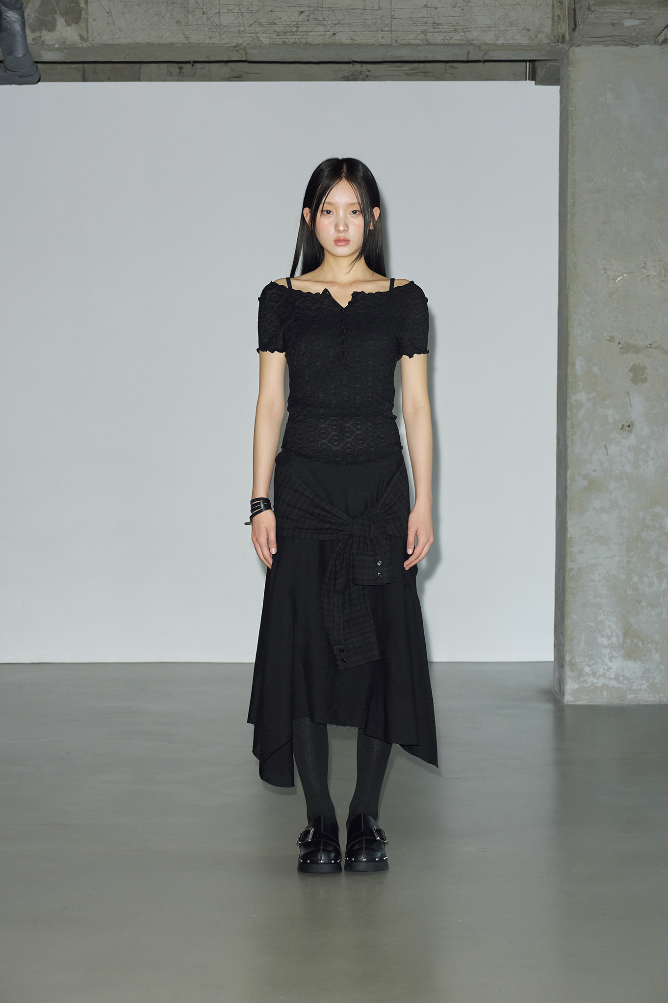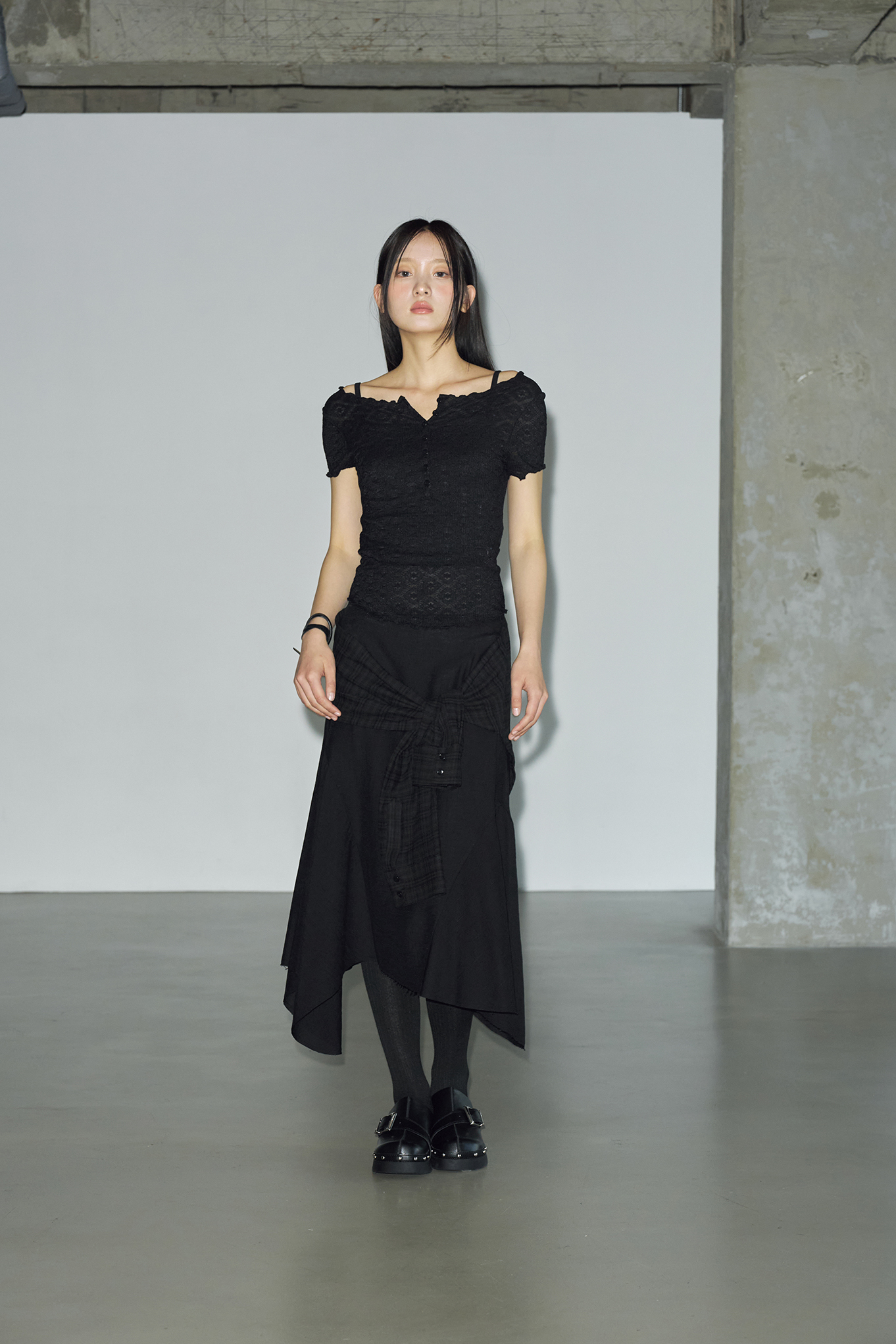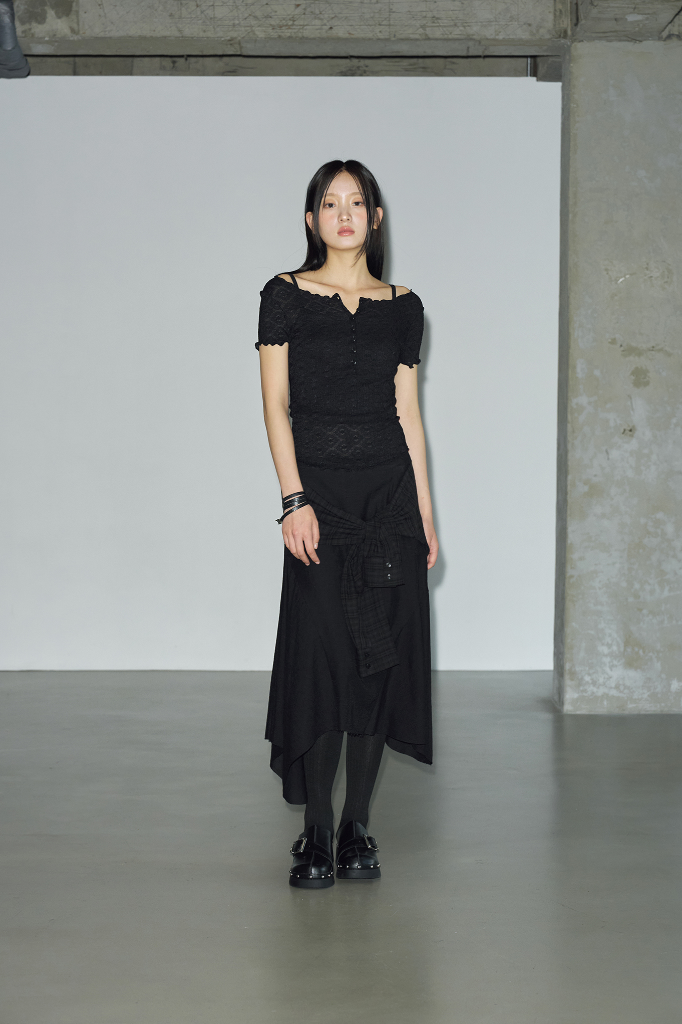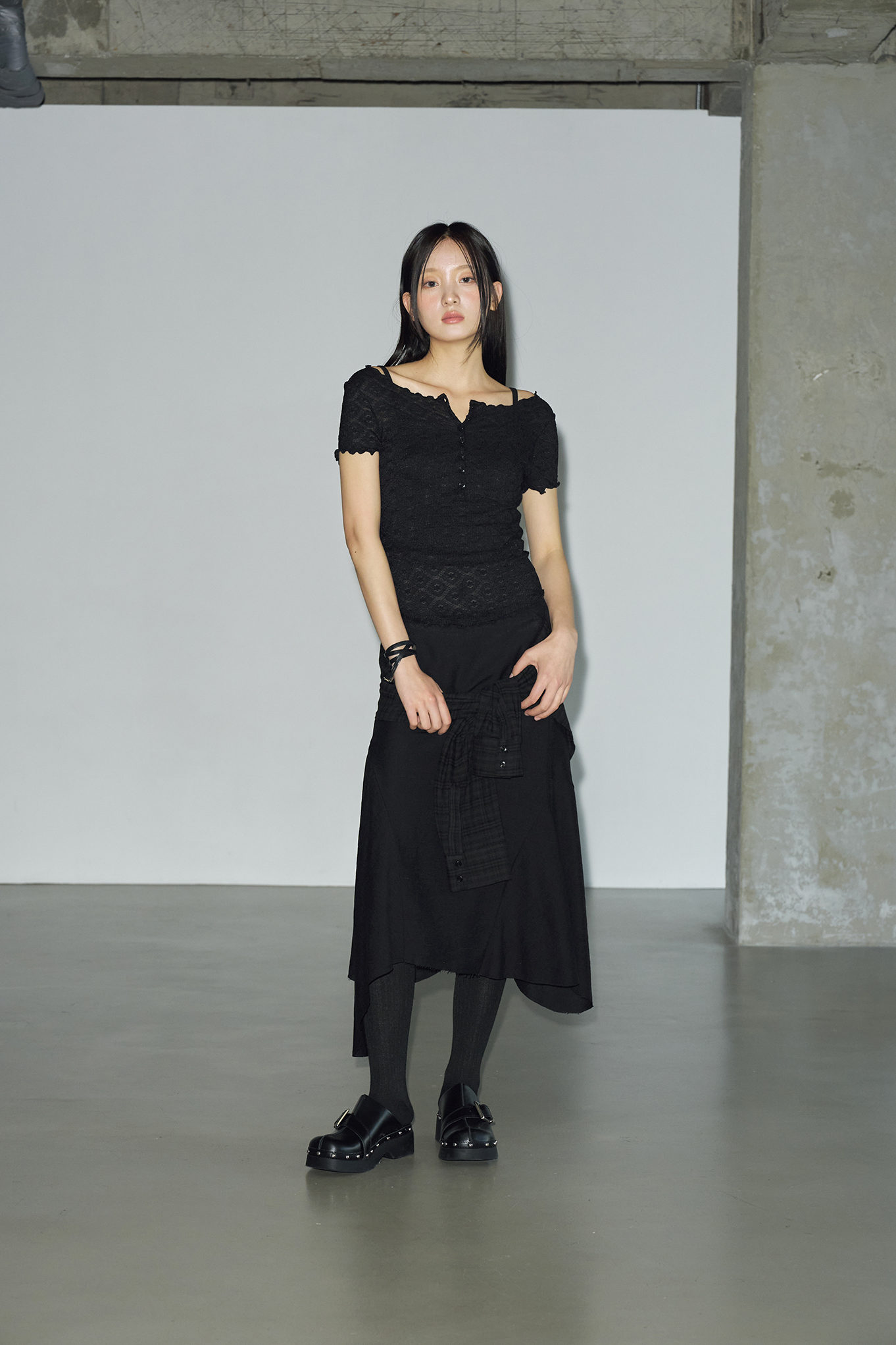 - 살이 비치는 매력의 시스루 레이스 패브릭으로 제작되어, 단품 착용이나 이너 레이어링 등 활용도가 높습니다.