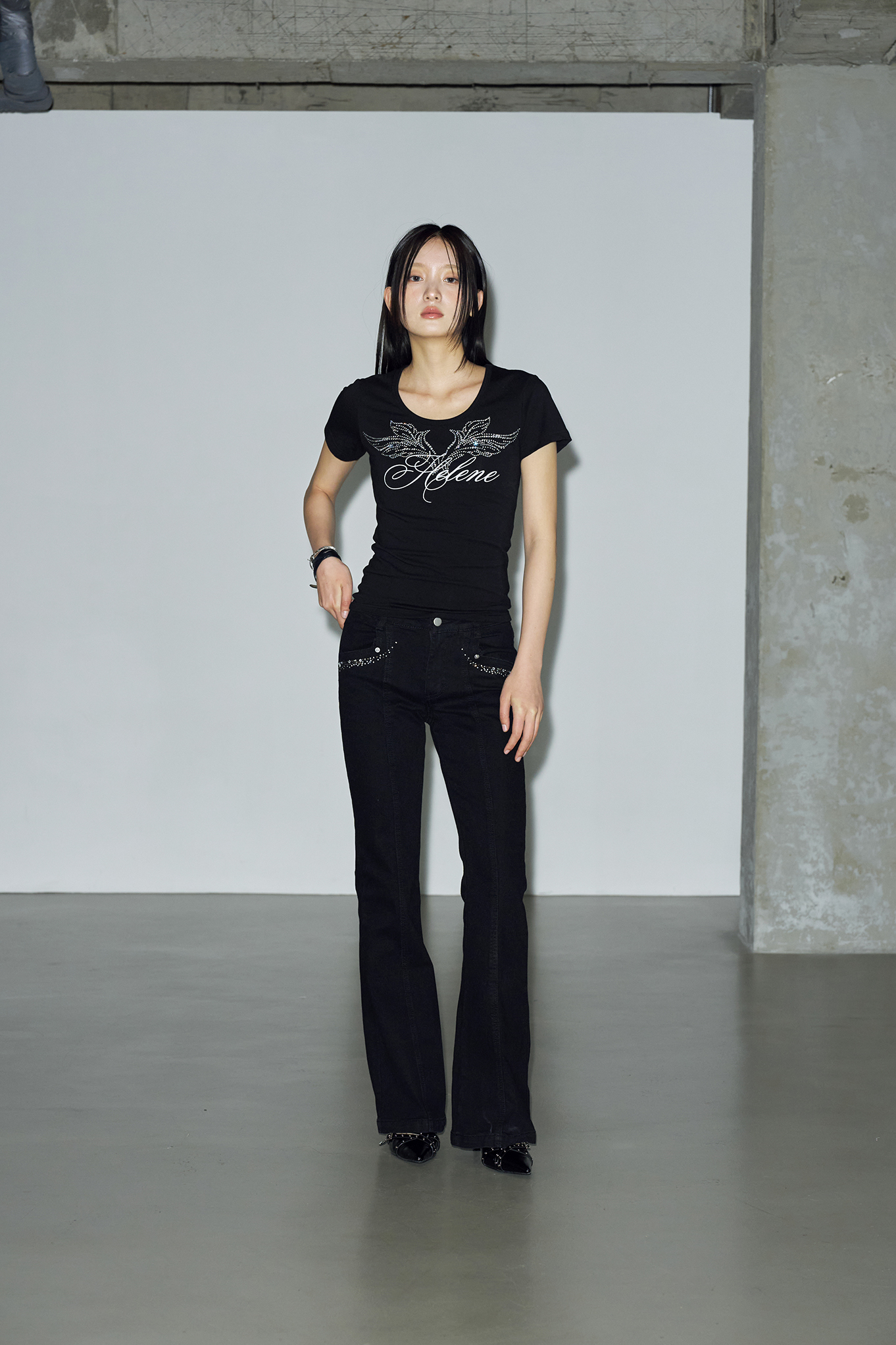 - 빈티지한 무드의 큐빅과 헬레네 필기체 프린트의 조화로 룩에 포인트를 줍니다.