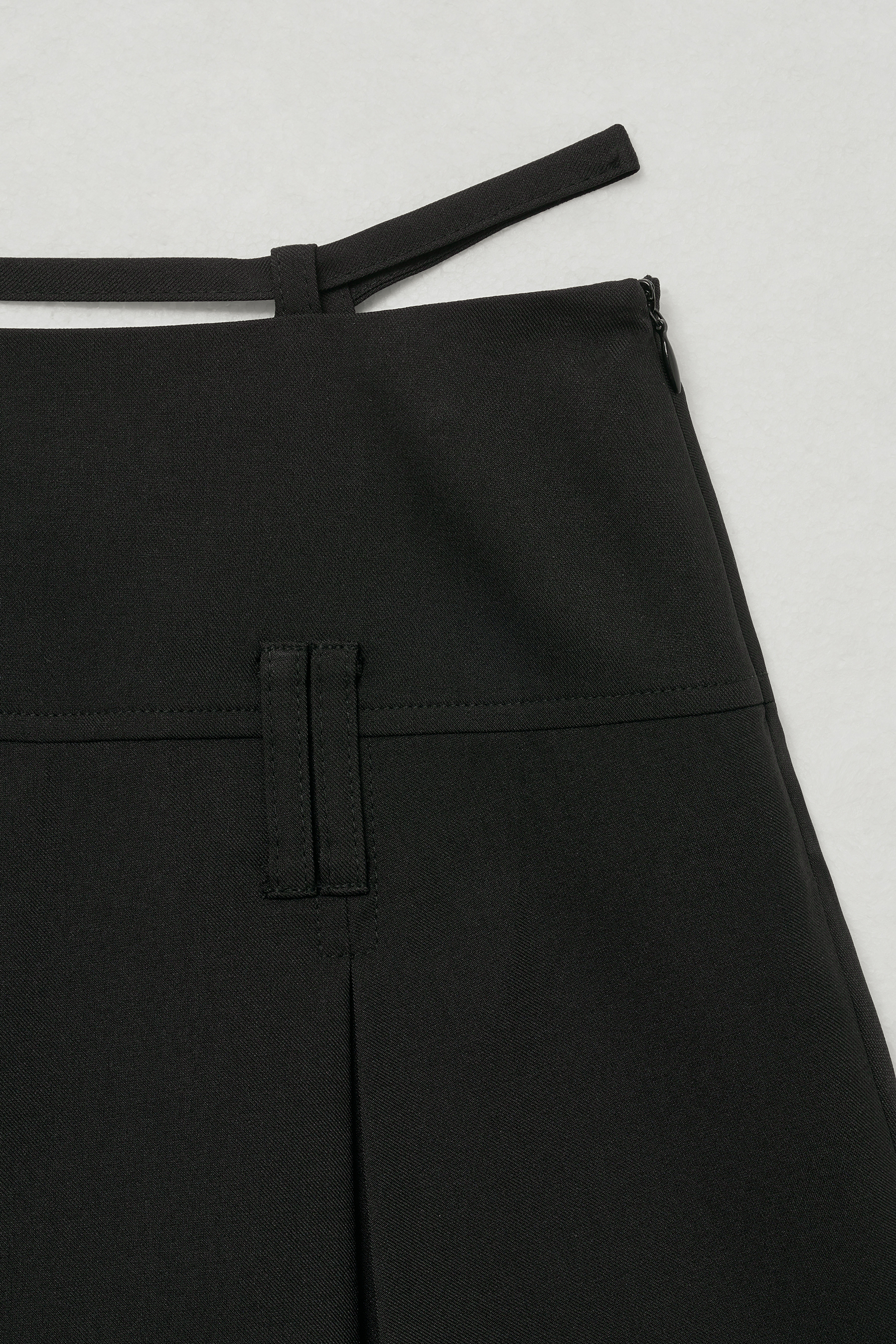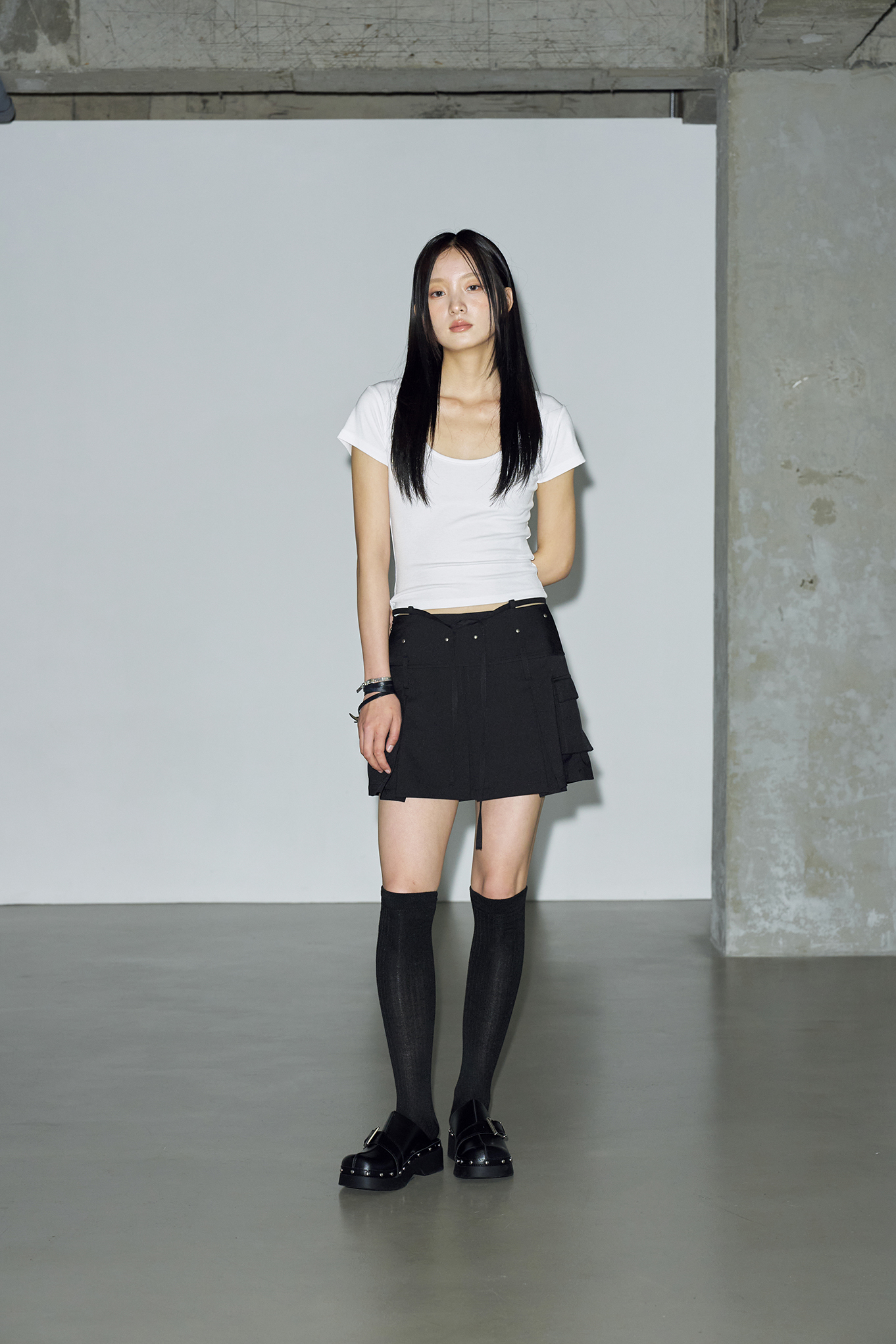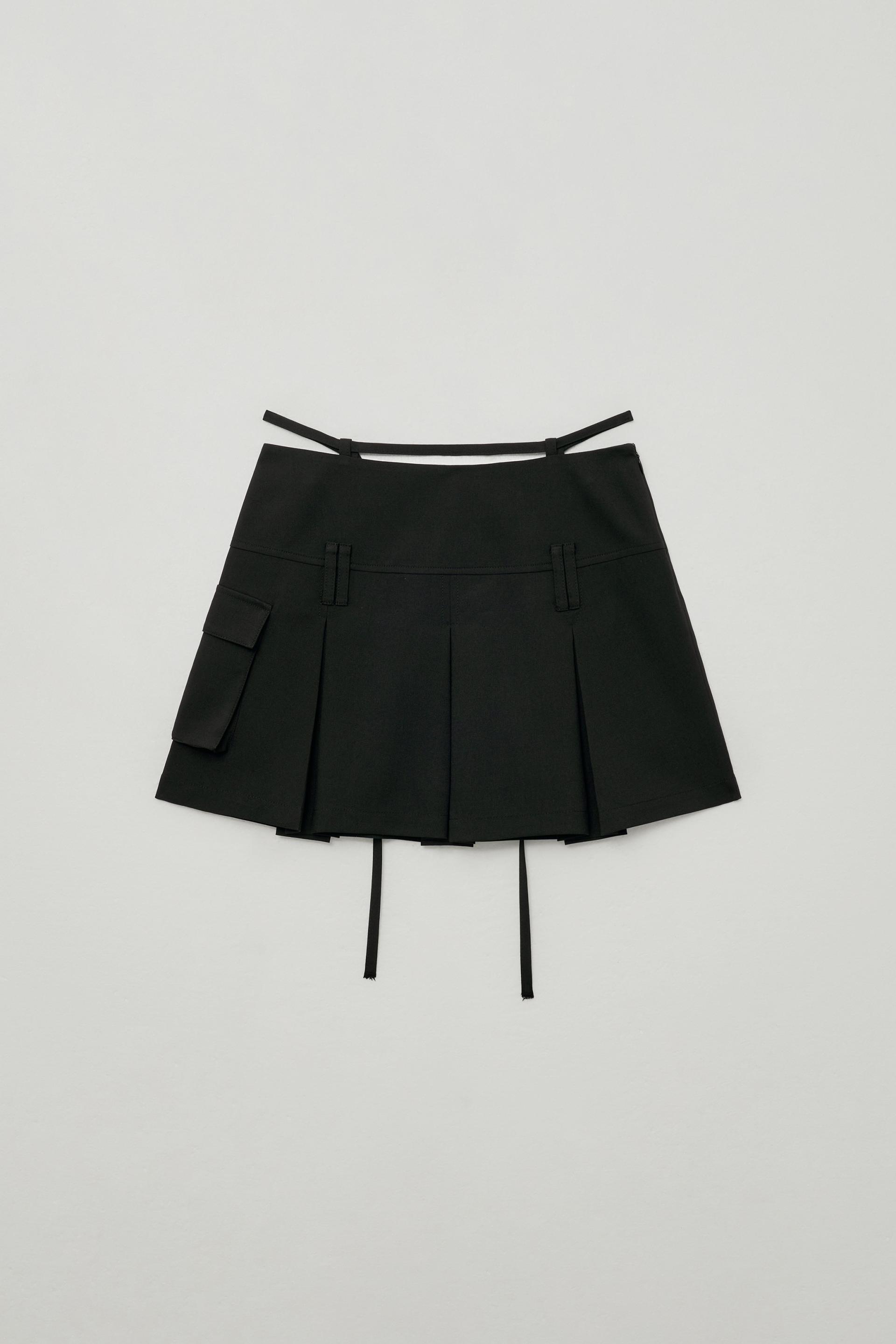 - 플리츠 디자인과 스트랩 레이어링이 매력적인 세미 A라인 미니 스커트입니다.