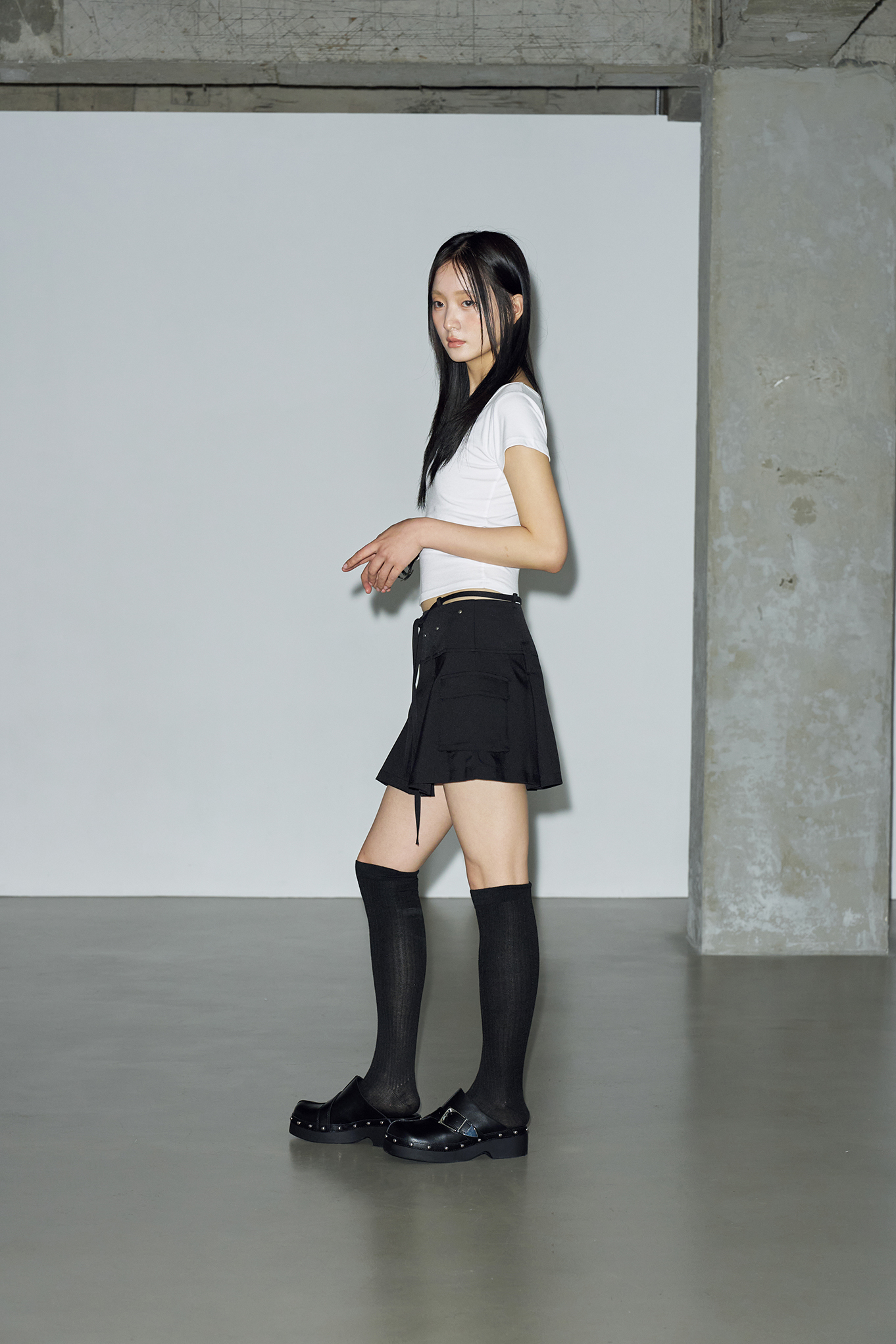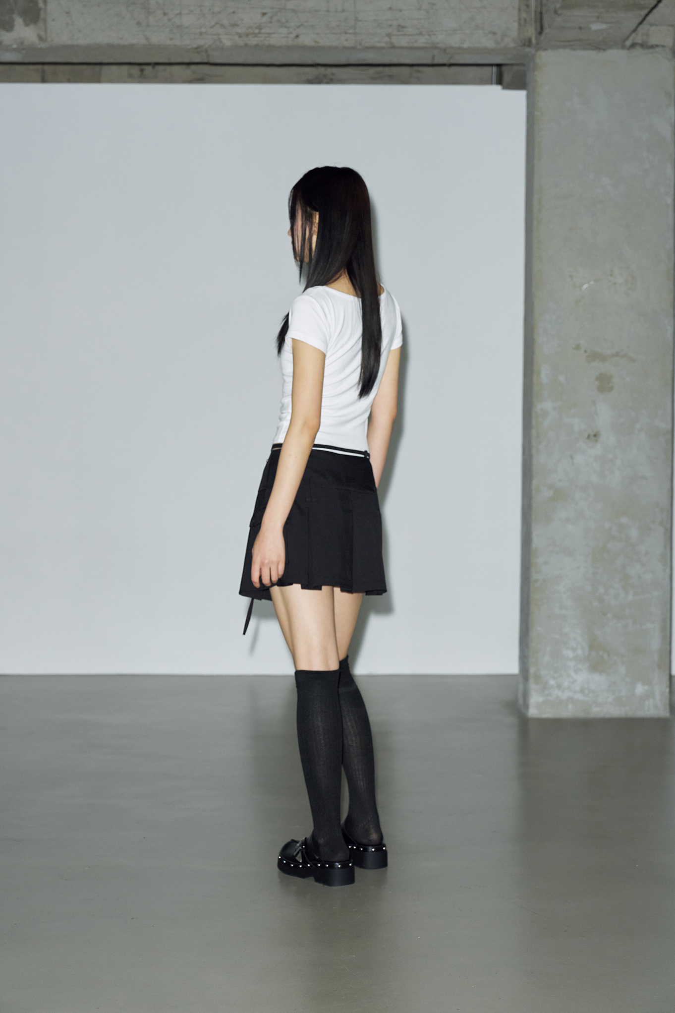 - 기존 플리츠 스커트 웨이스트 라인에 스터드 포인트를 추가하여 락시크 무드를 녹여냈습니다.