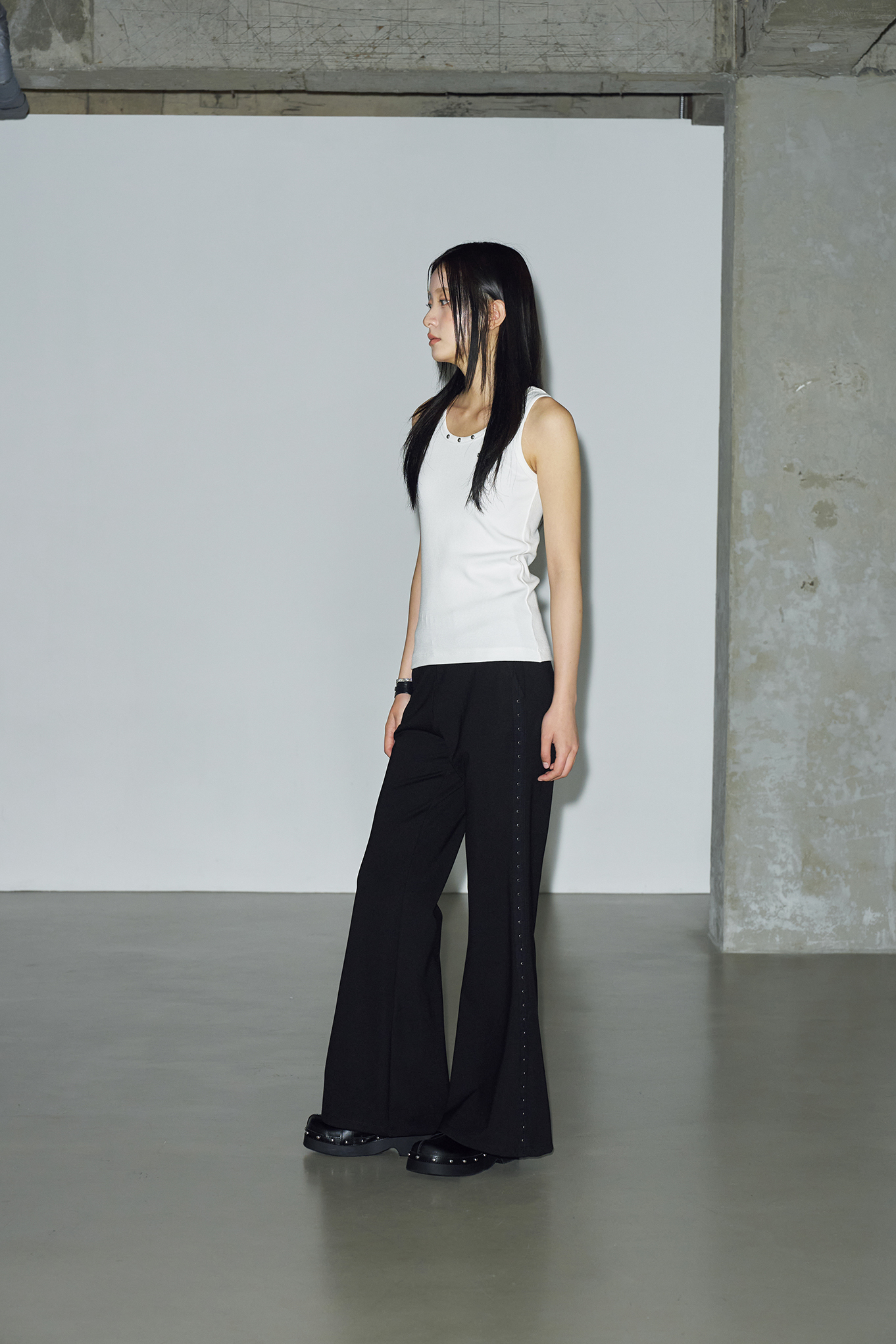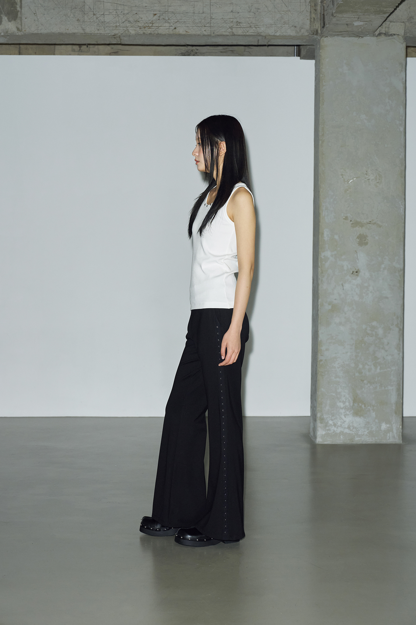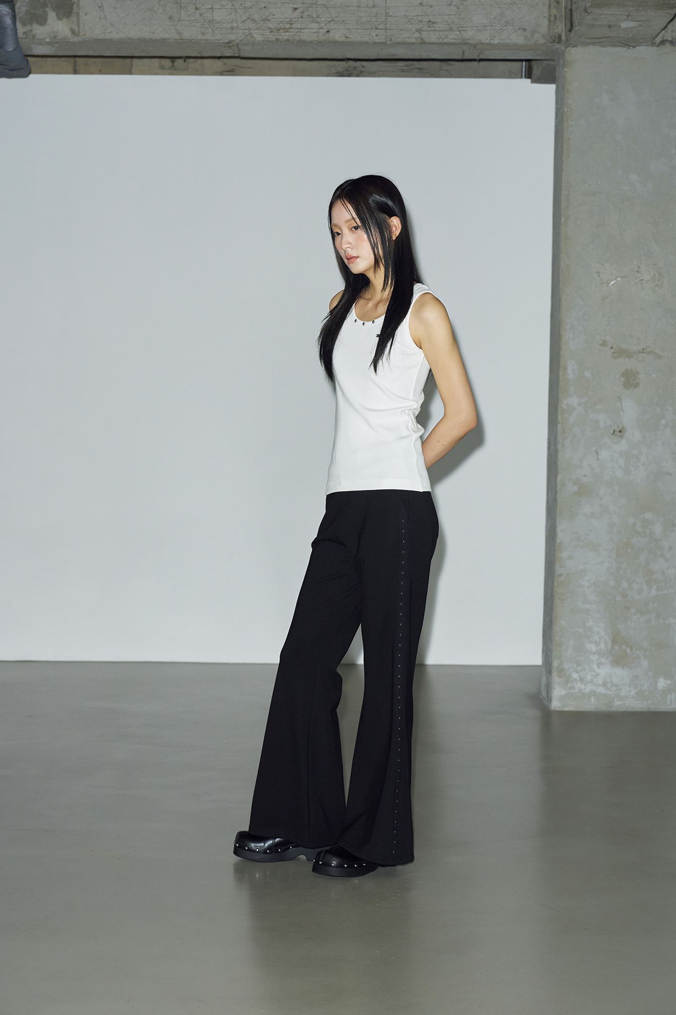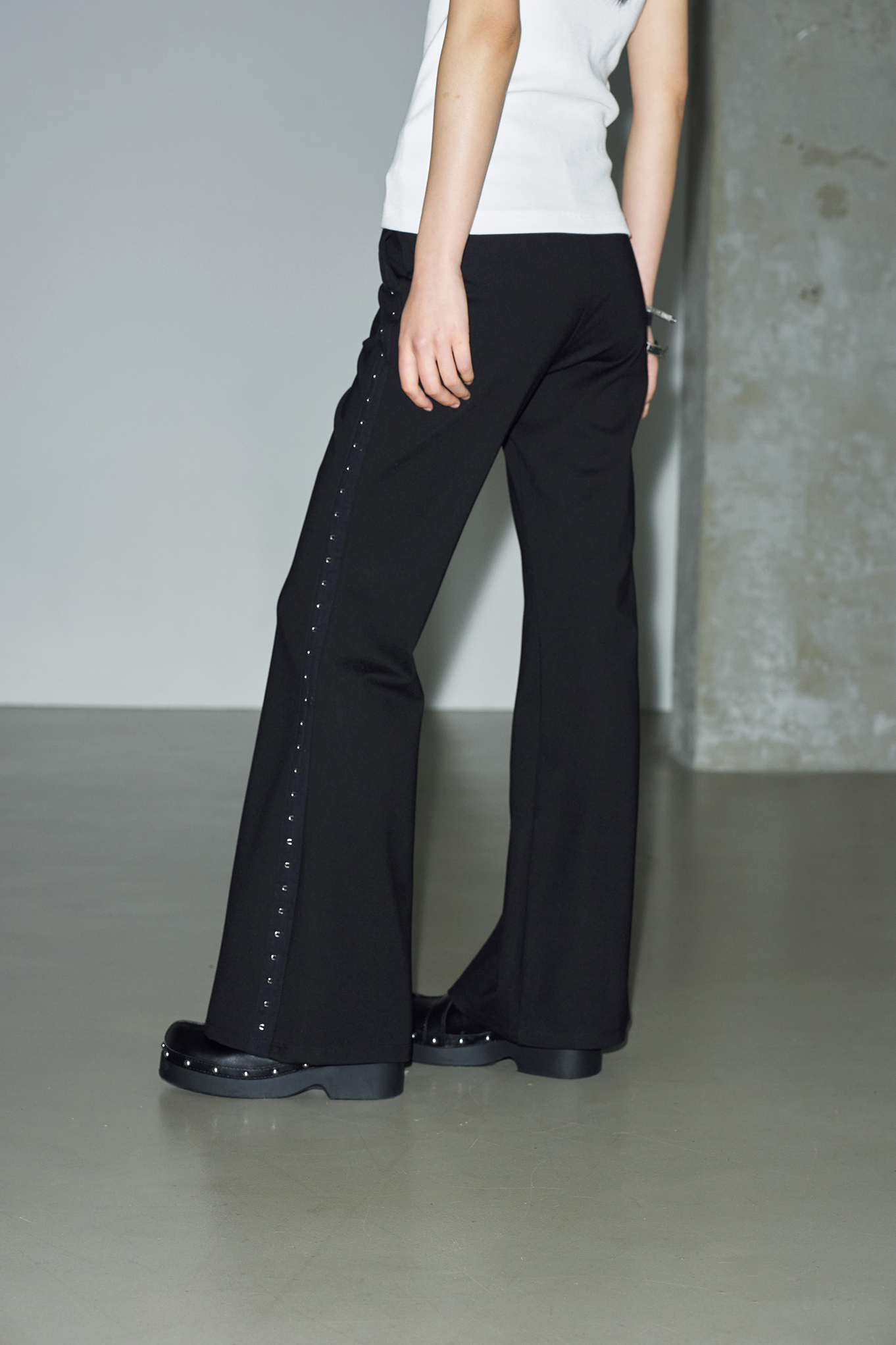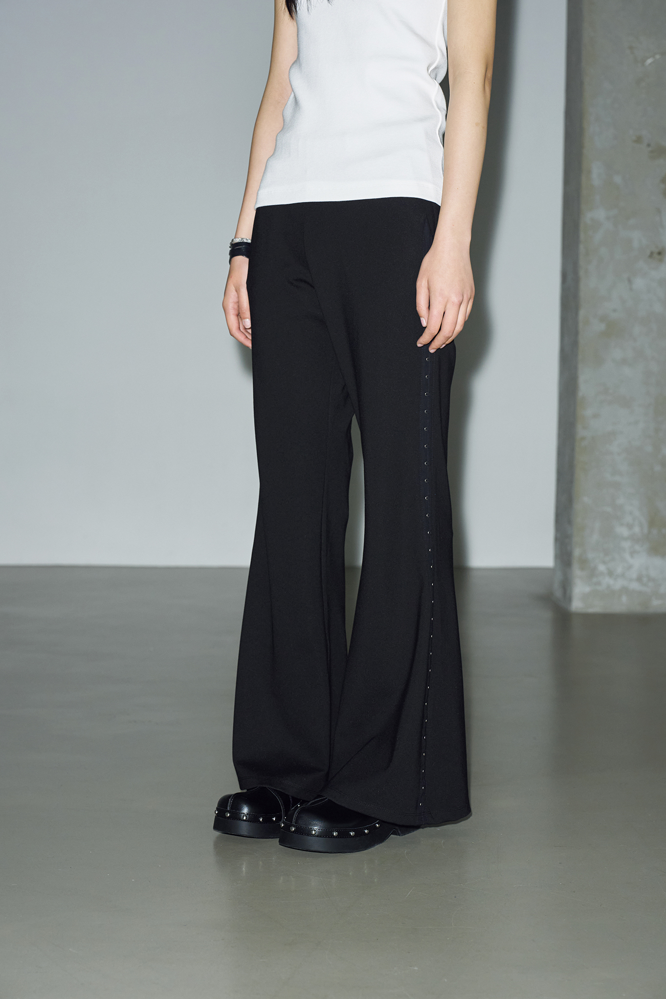 - 사이드에 더해진 훅 앤 아이 디테일이 인상적인 슬림핏 부츠컷 팬츠입니다.