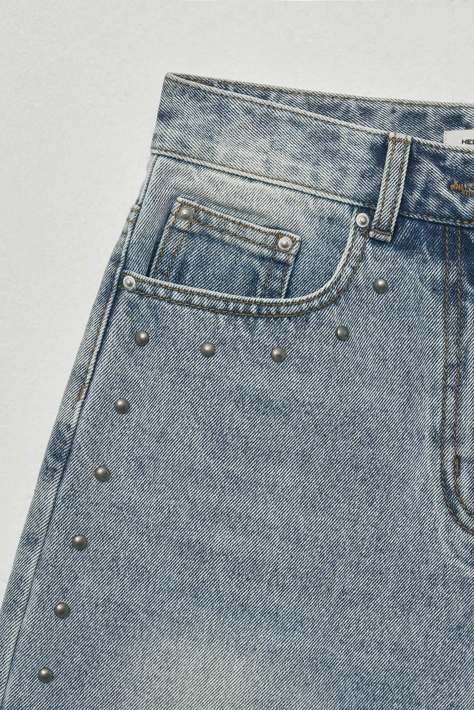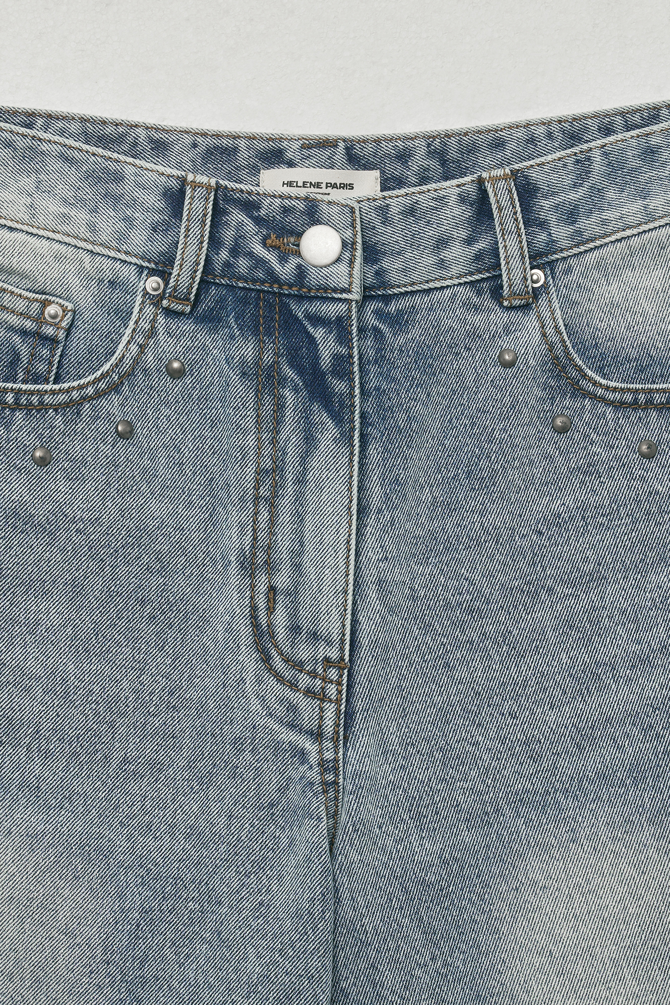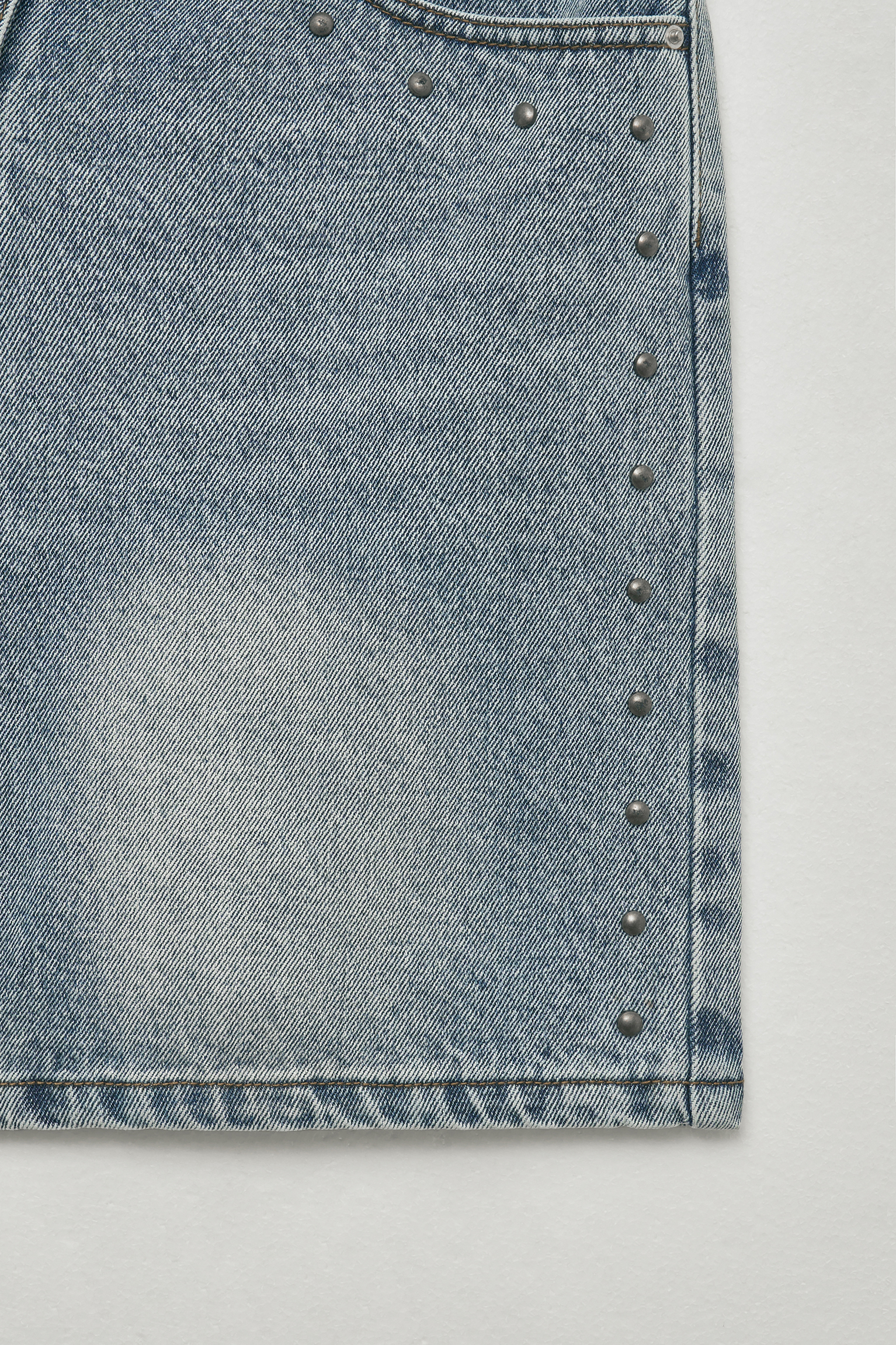 - 포켓부터 밑단까지 이어지는 스터드 장식으로 빈티지한 감성을 표현해줍니다. 여름 시즌에 어울리는 라이트한 톤으로 시원한 느낌을 살려주고 다양한 상의와 자연스럽게 매치됩니다.