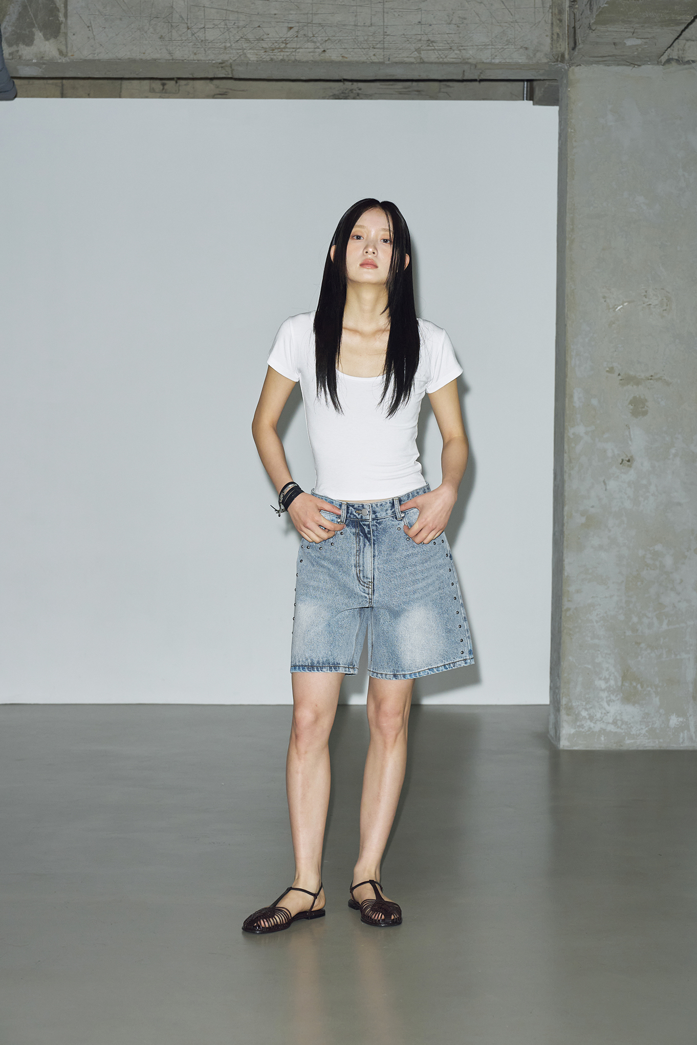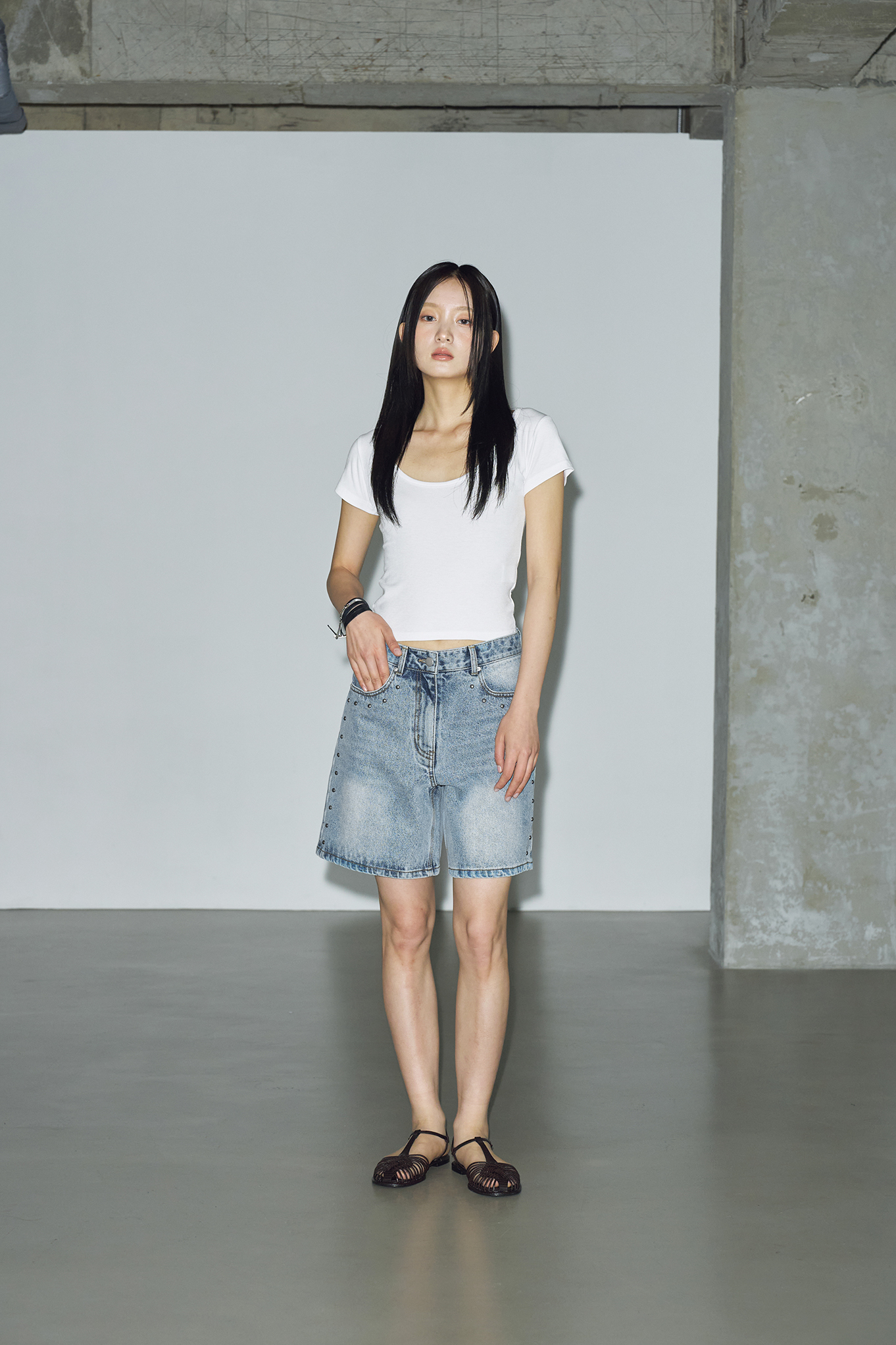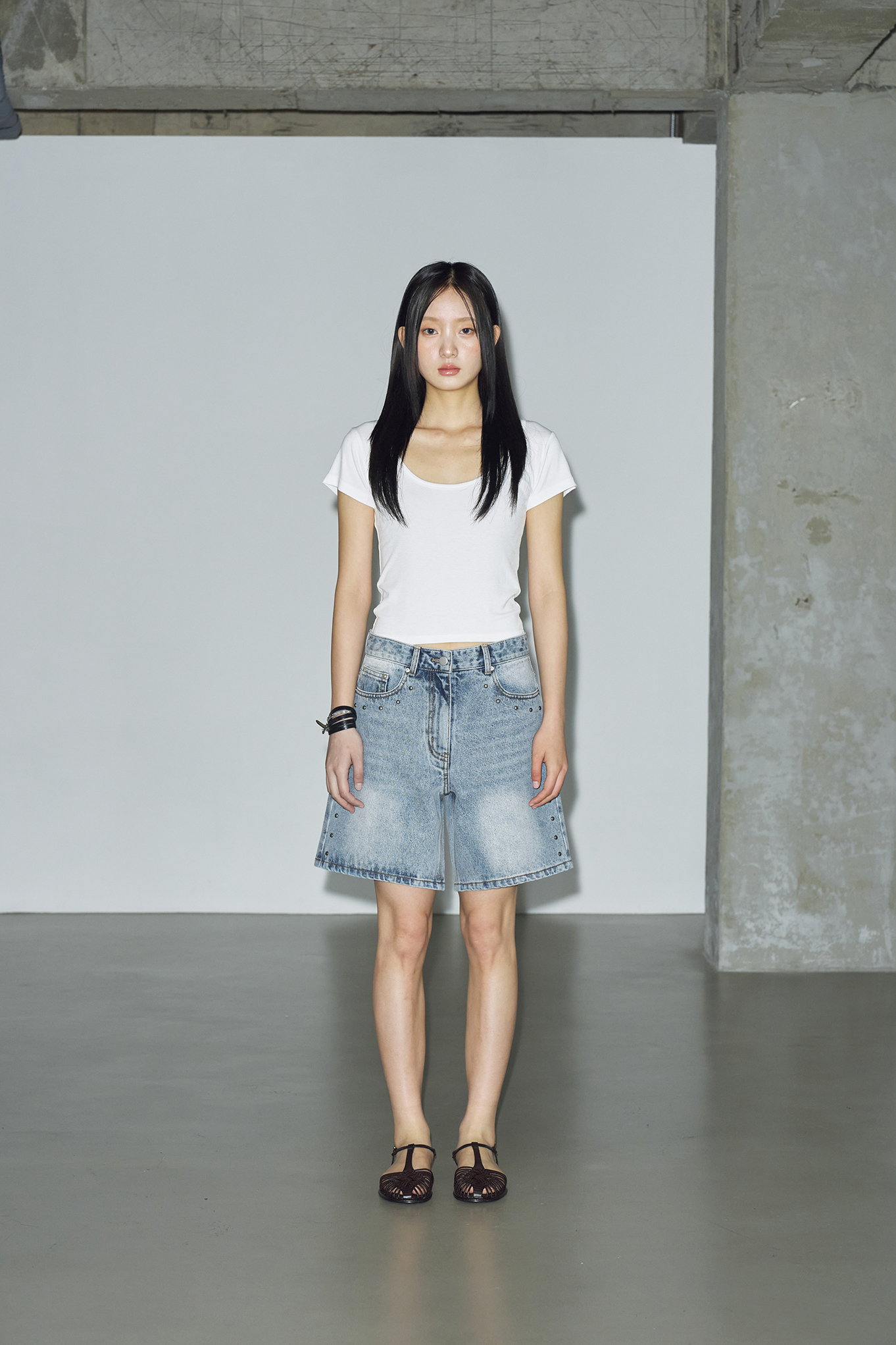 - 포켓부터 밑단까지 이어지는 스터드 장식으로 빈티지한 감성을 표현해줍니다. 여름 시즌에 어울리는 라이트한 톤으로 시원한 느낌을 살려주고 다양한 상의와 자연스럽게 매치됩니다.