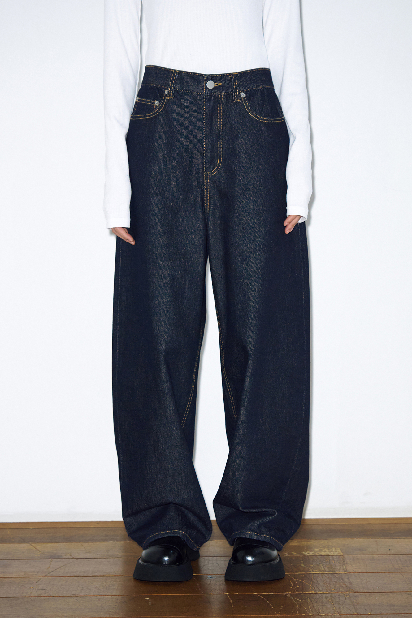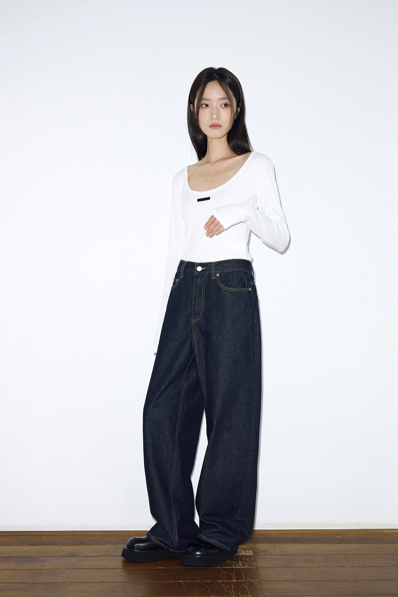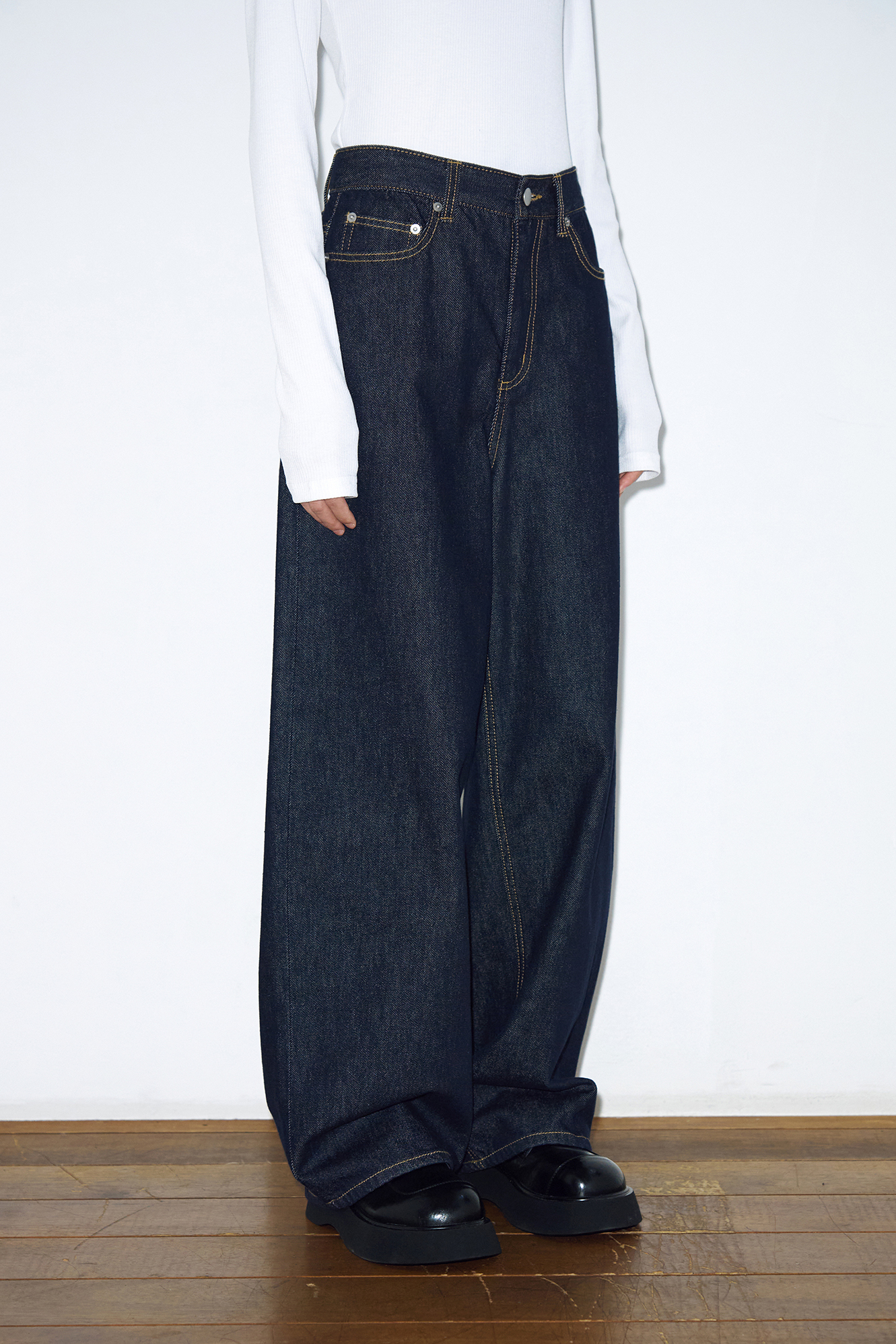 - 미드-로우 라이즈, 와이드 핏 가먼트입니다.