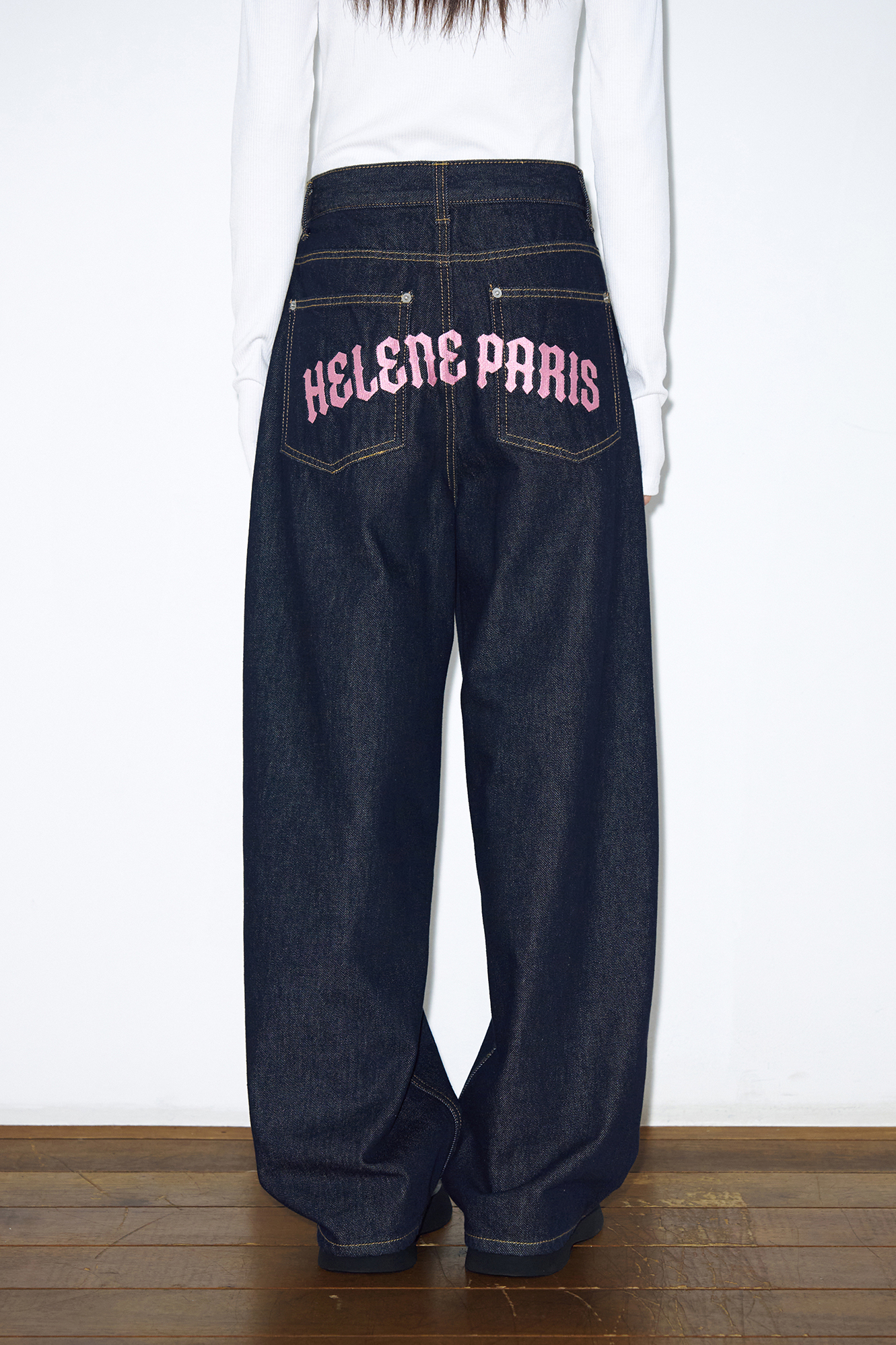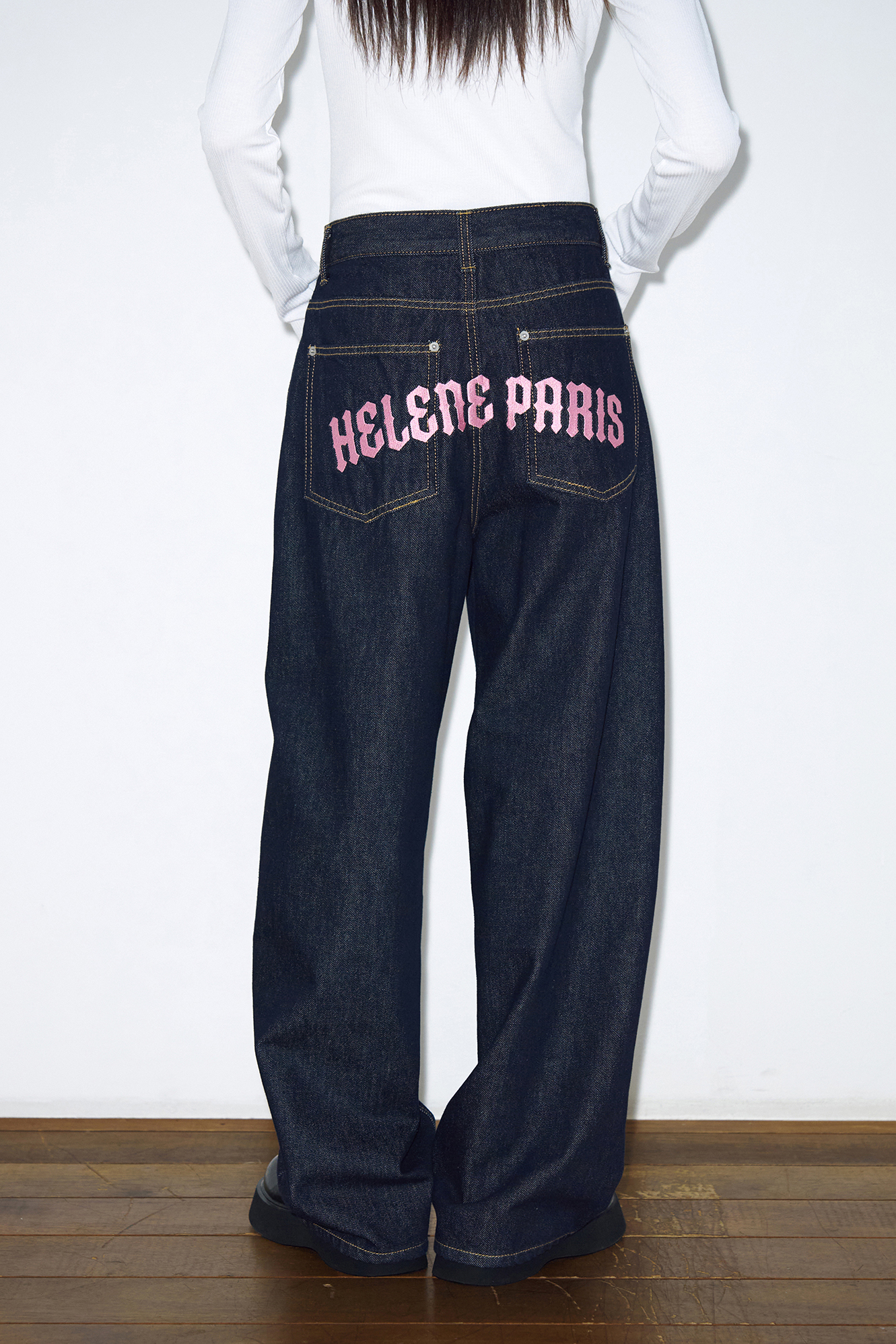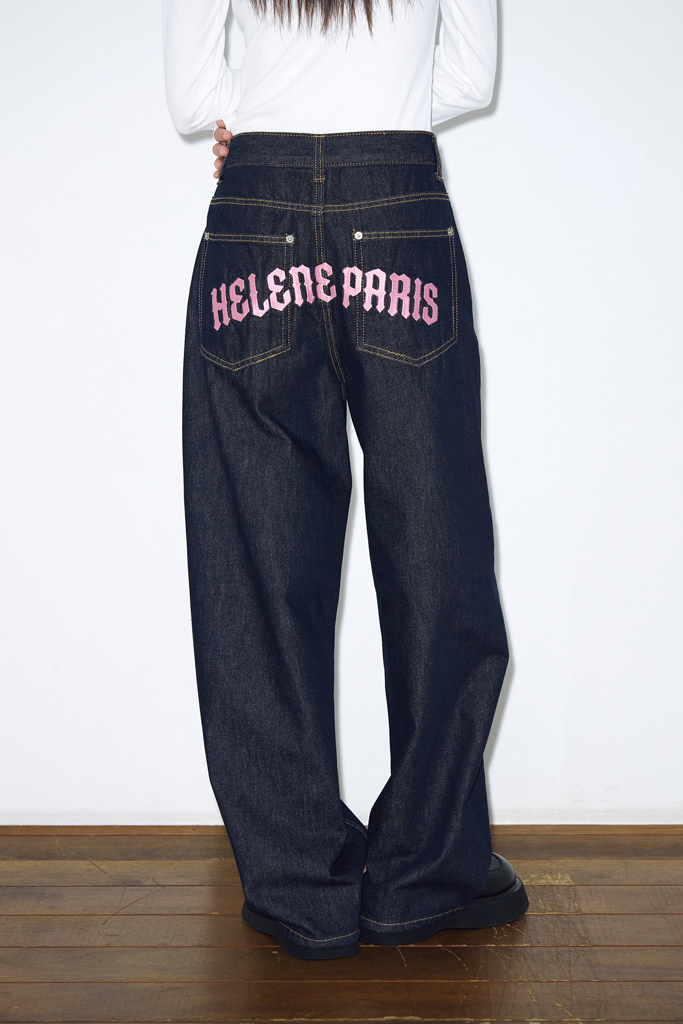- 가먼트 노말 워싱과 핑크 로고 니들 자수가 포인트인 빈티지 와이드 데님 팬츠입니다.