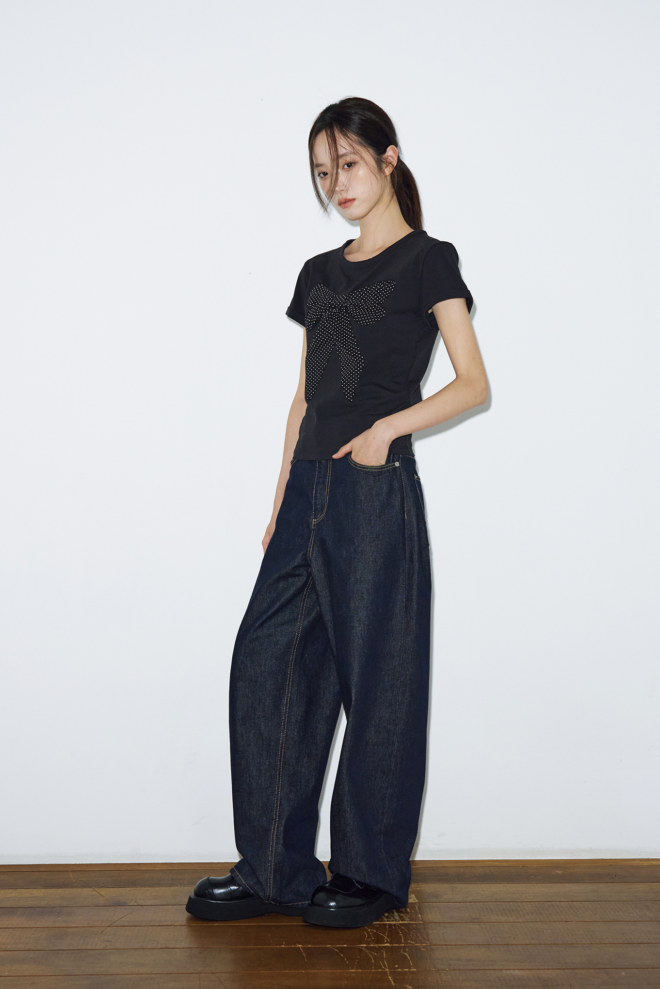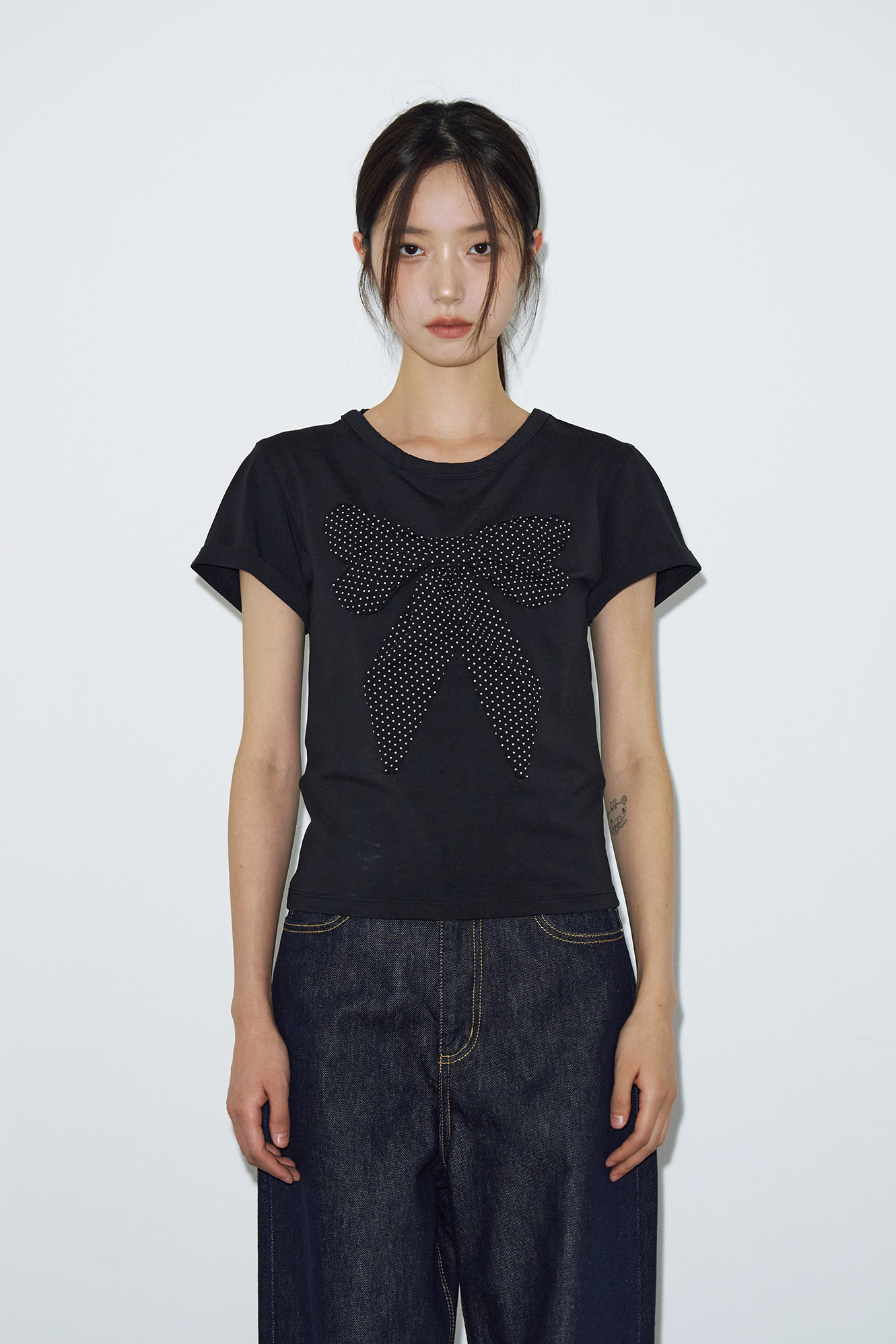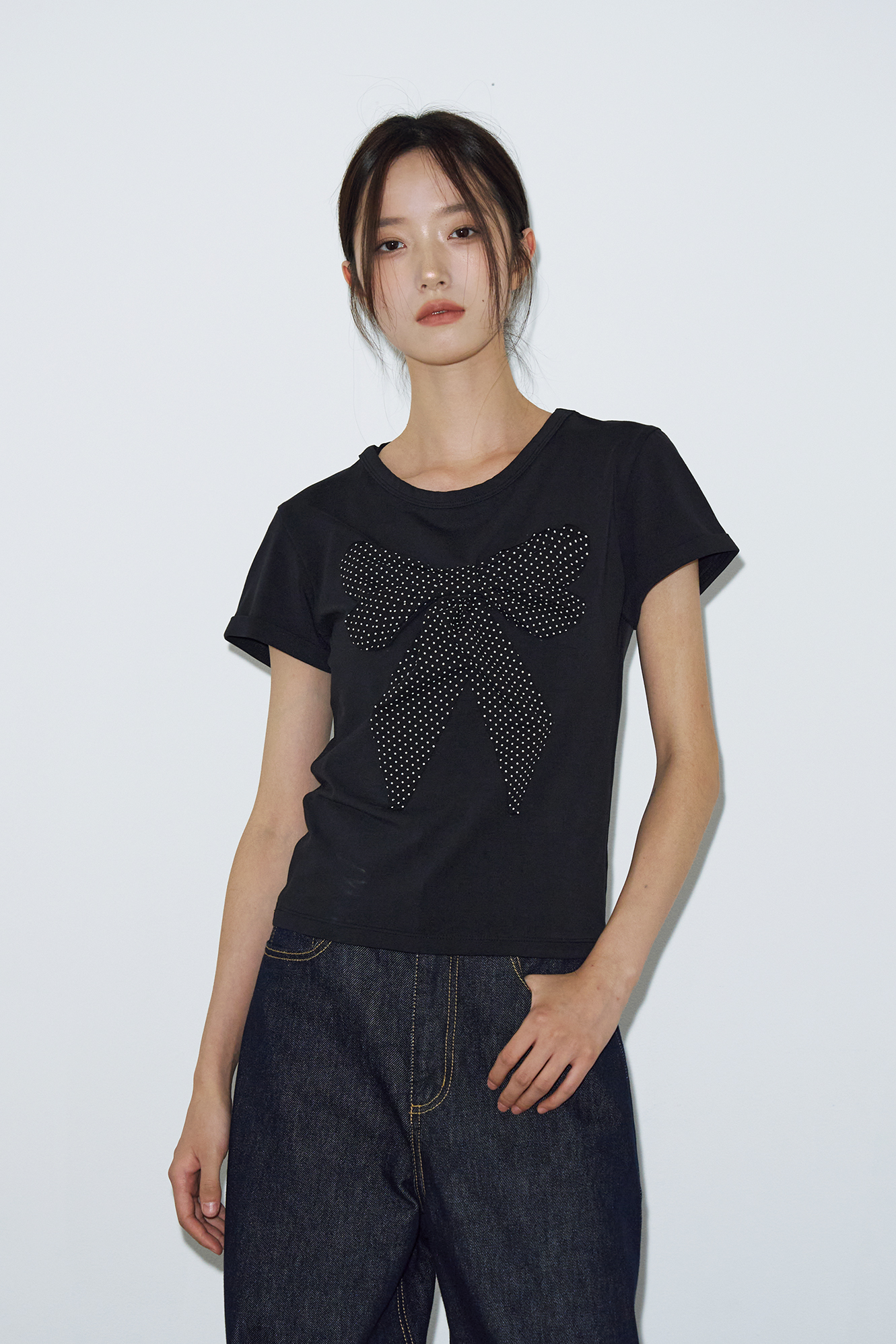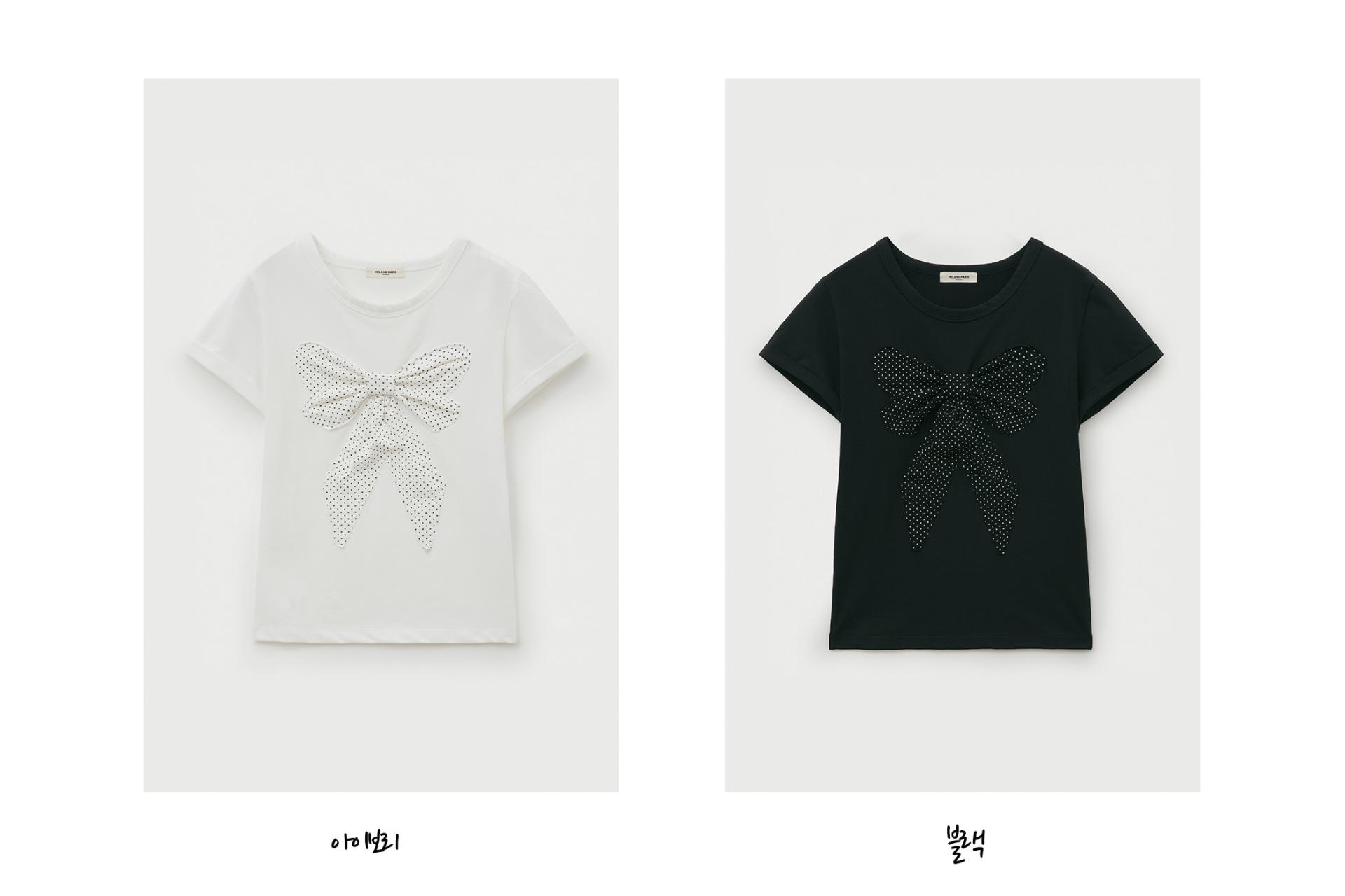 - 페미닌한 도트 리본 아플리케 디테일이 포인트인 하프 티셔츠입니다.