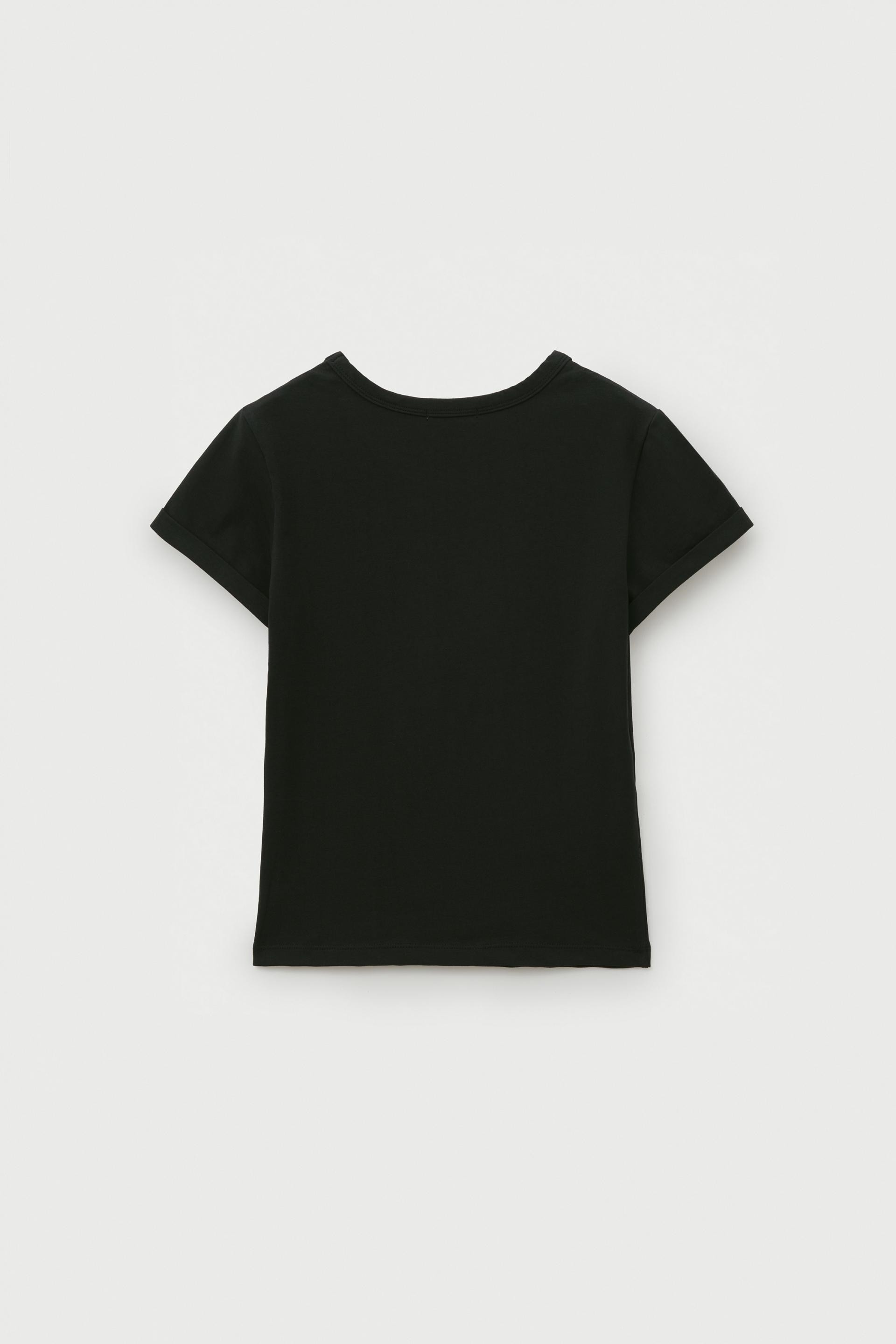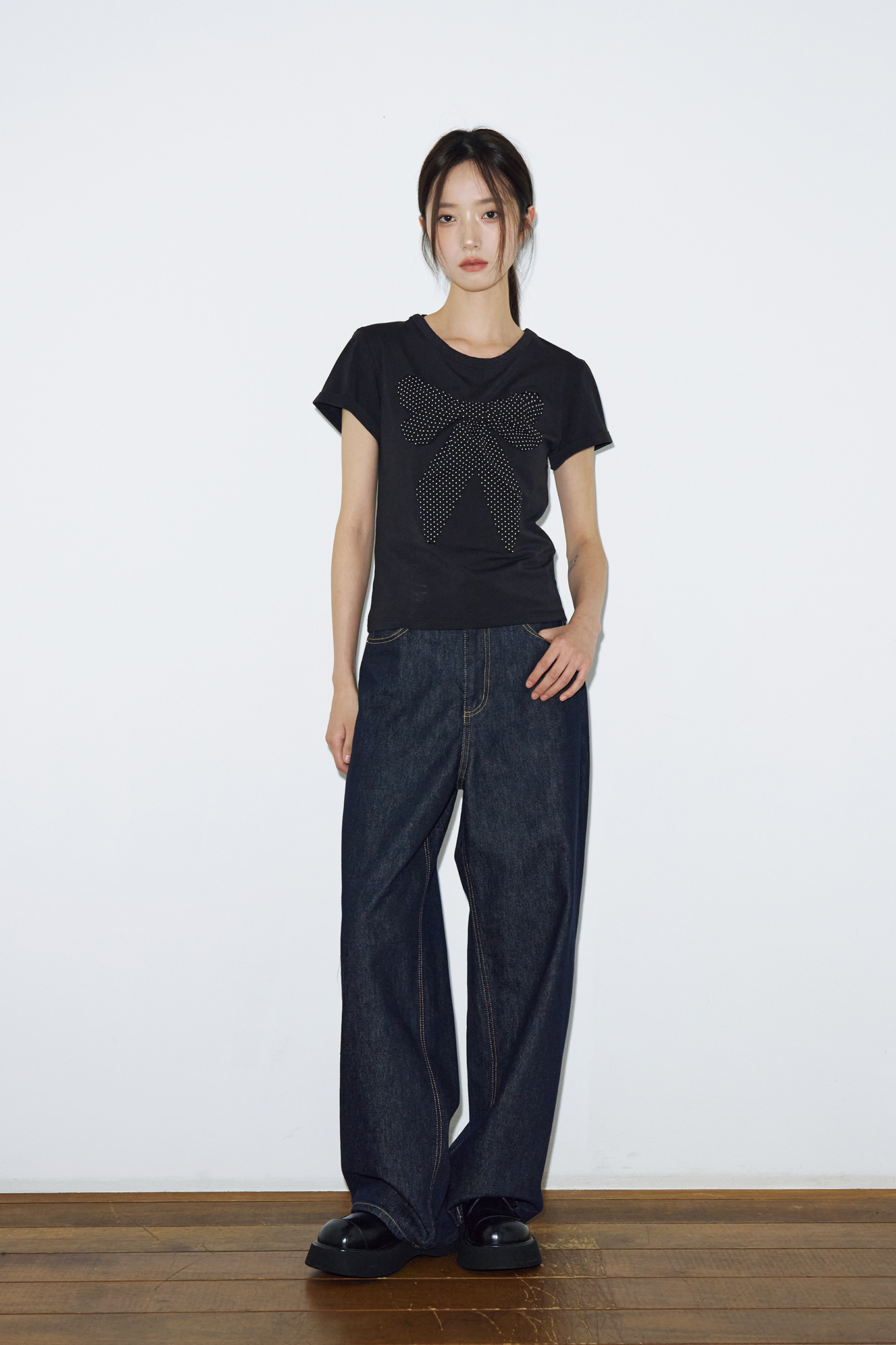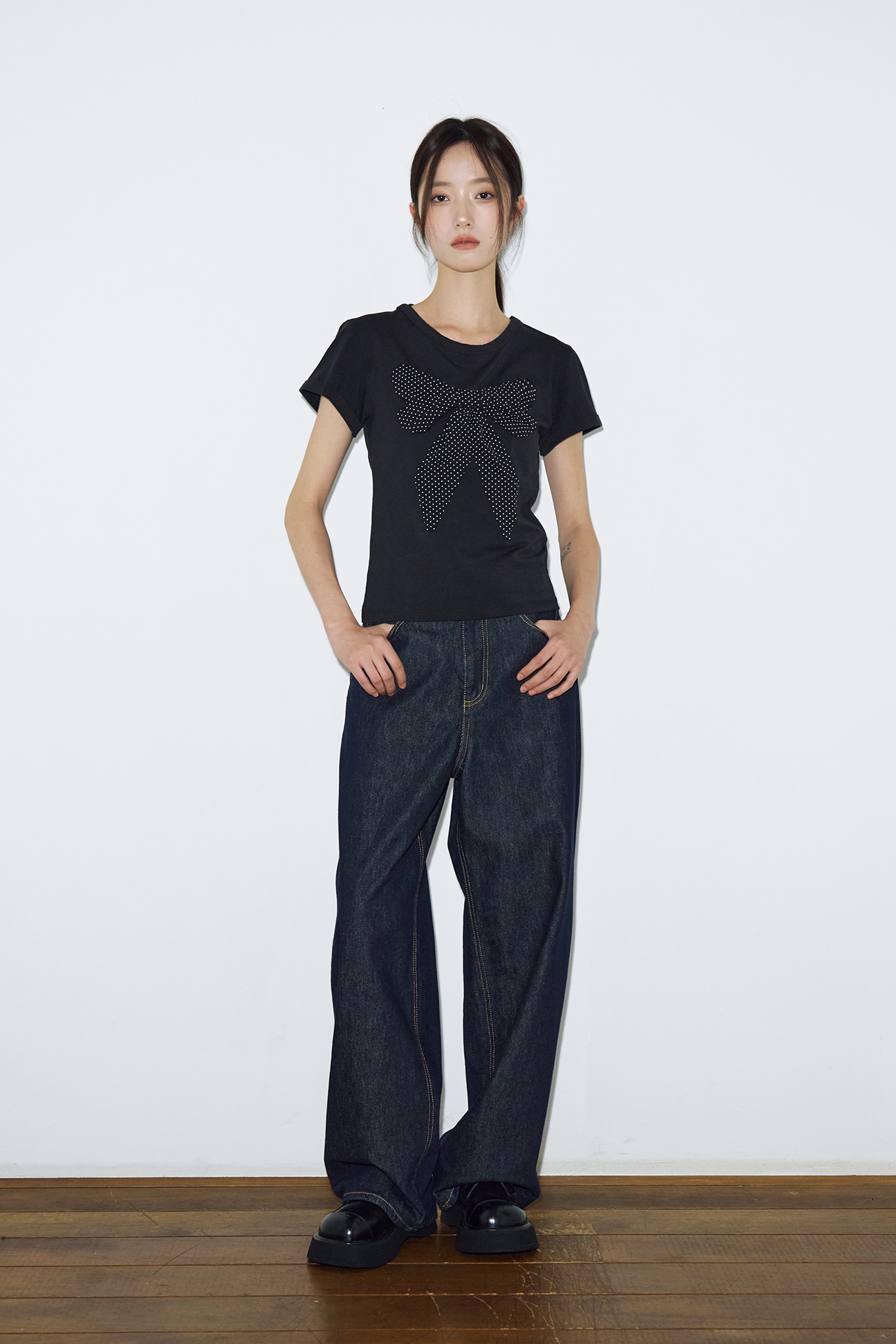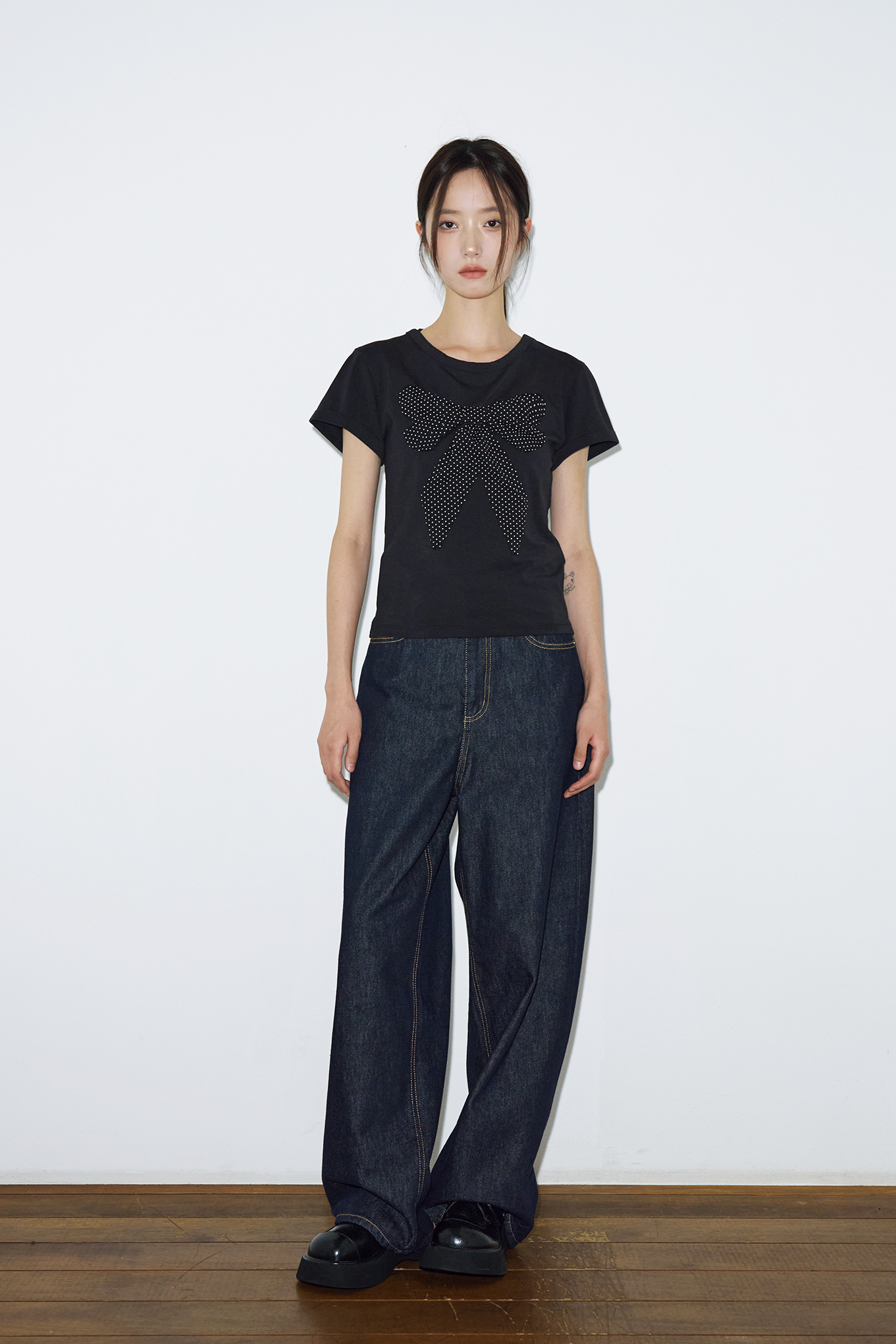 리본 아플리케 도트 하프 티셔츠 [블랙]