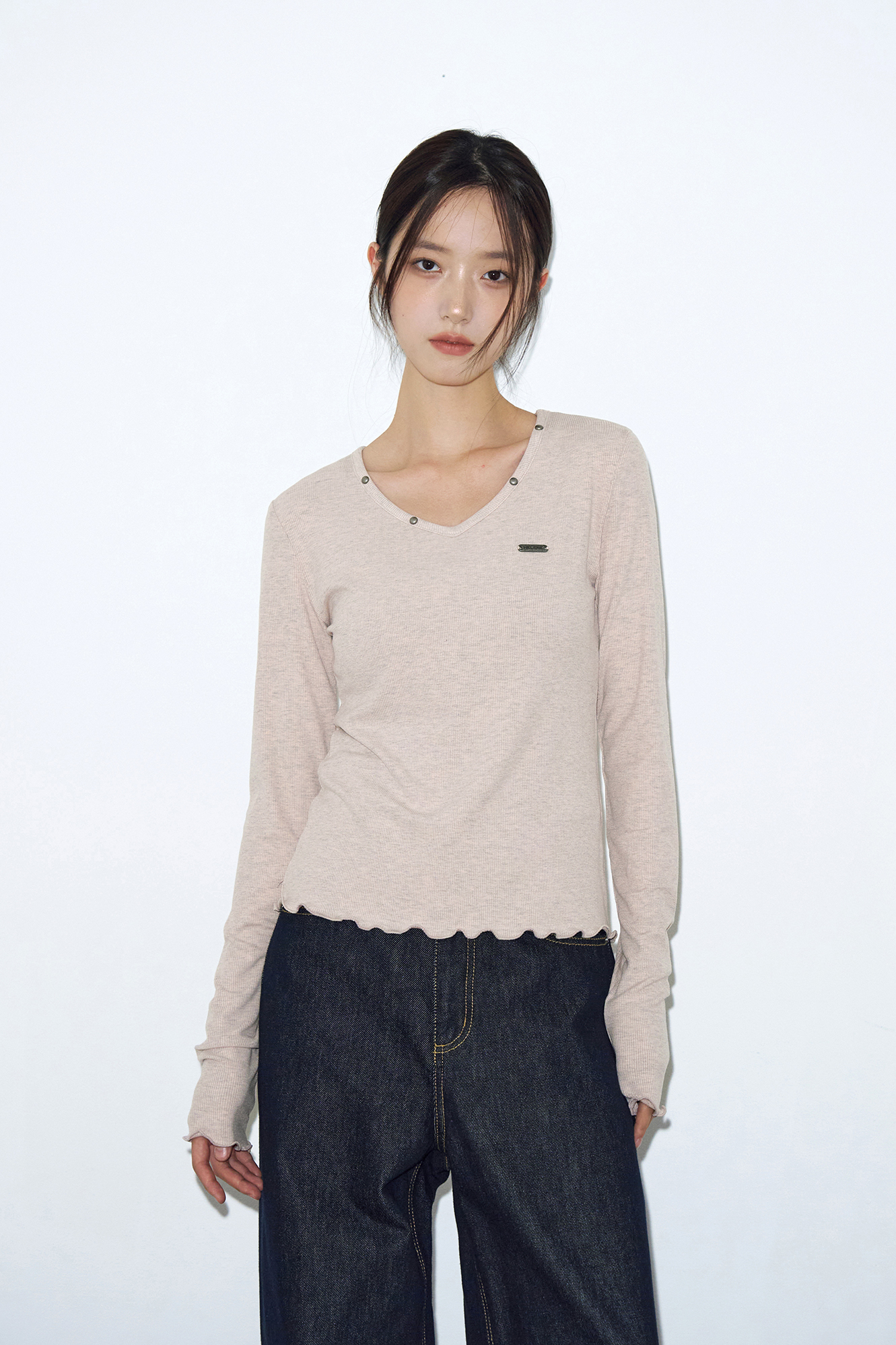 - 쇄골까지 적당히 드러나는 깊이의 V넥 라인입니다.