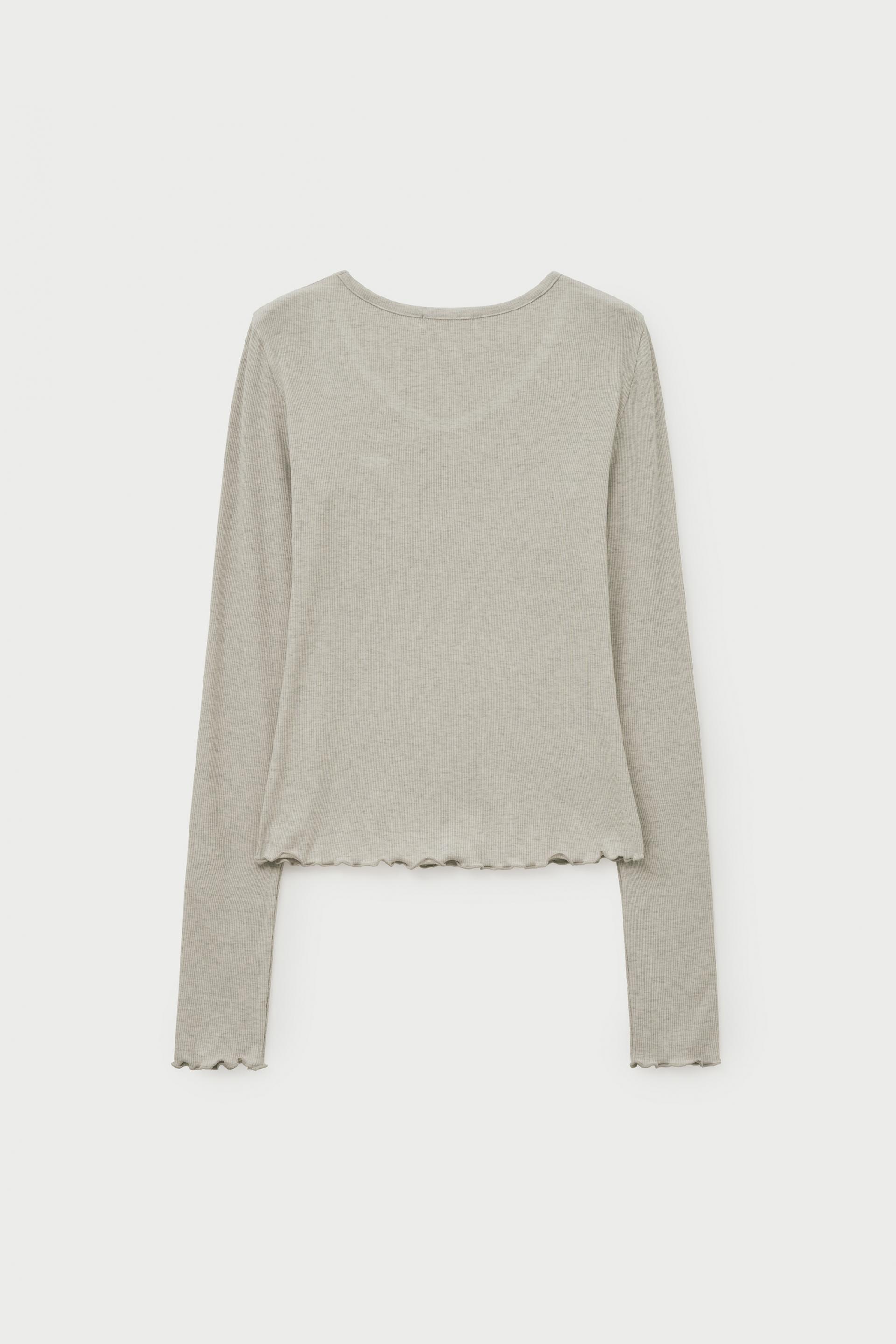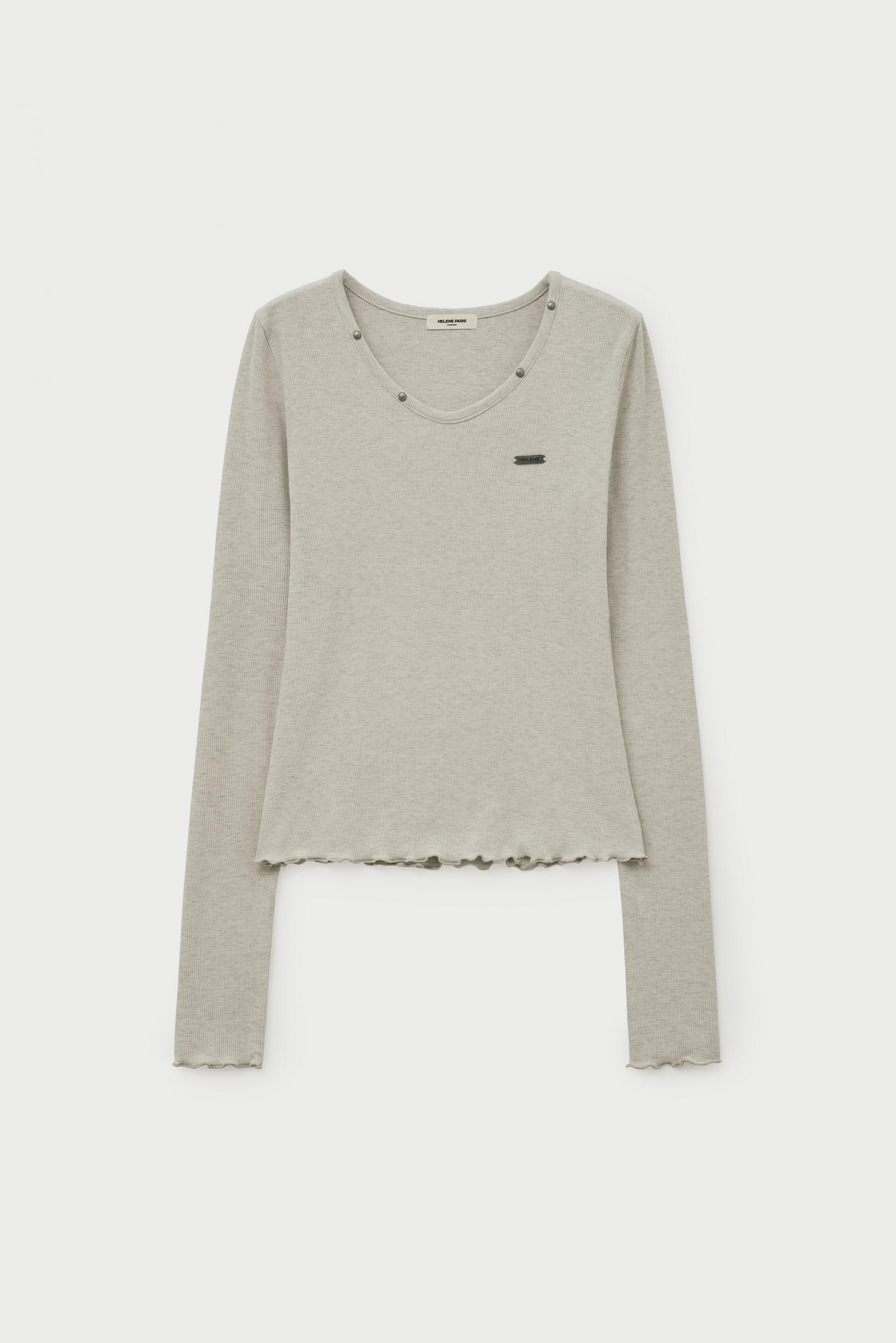 - 리브드 넥 라인에 스터드 포인트가 언밸런스하게 더해진 롱 슬리브입니다.