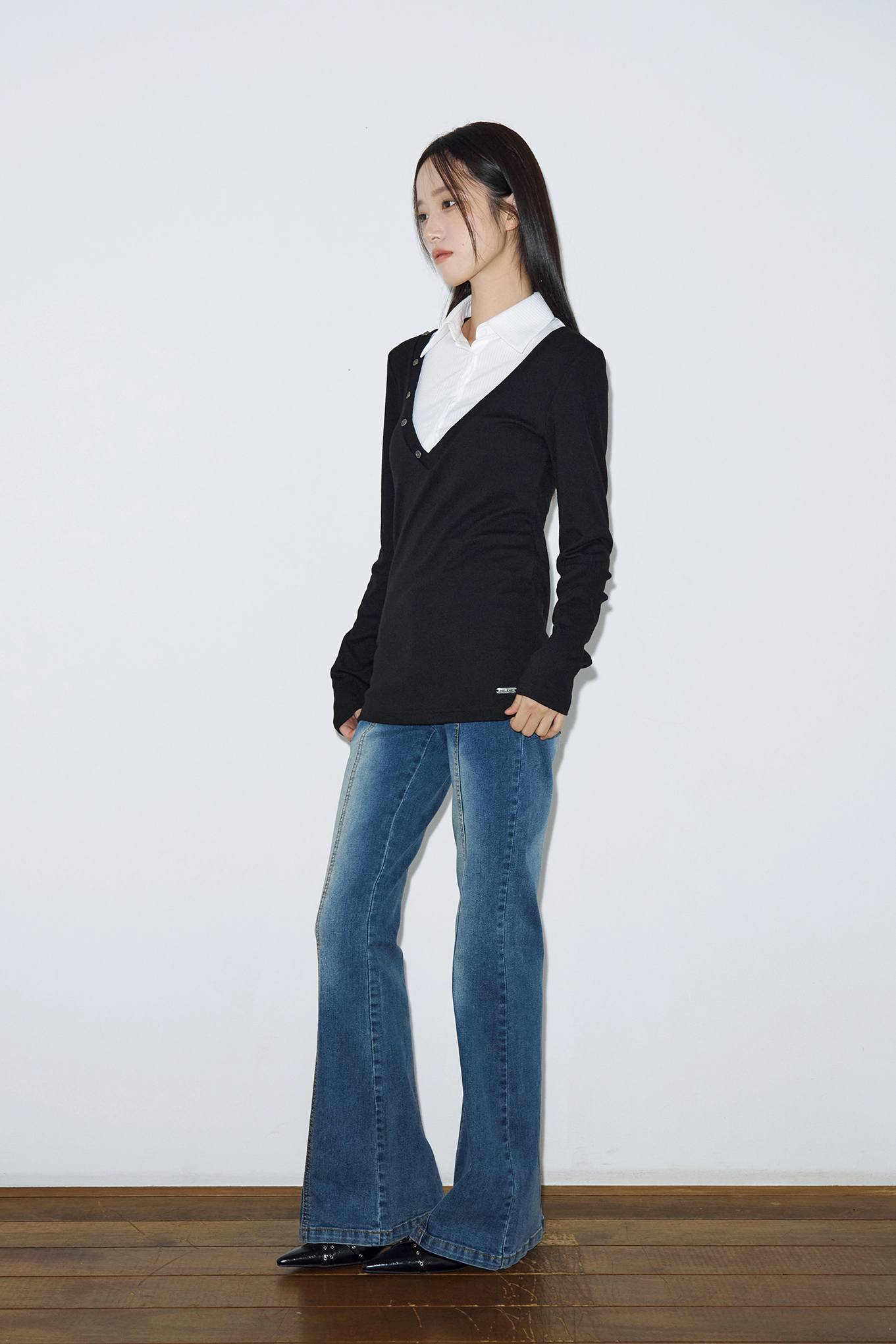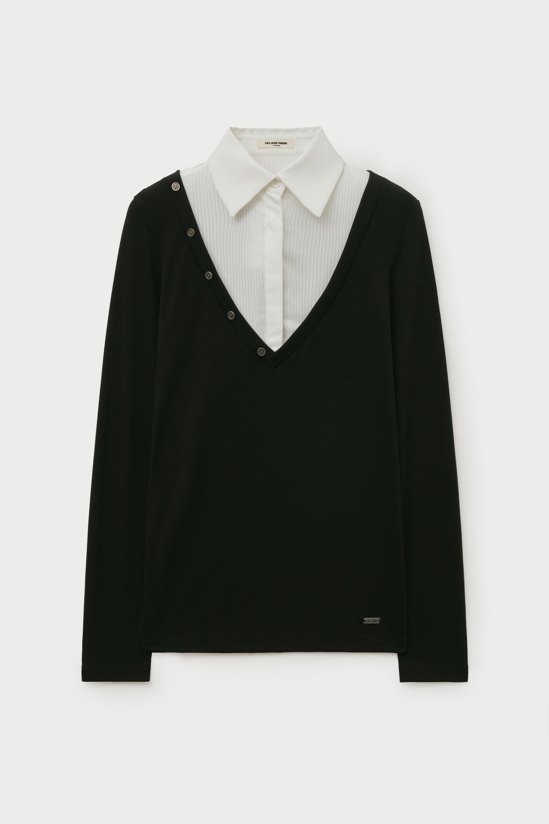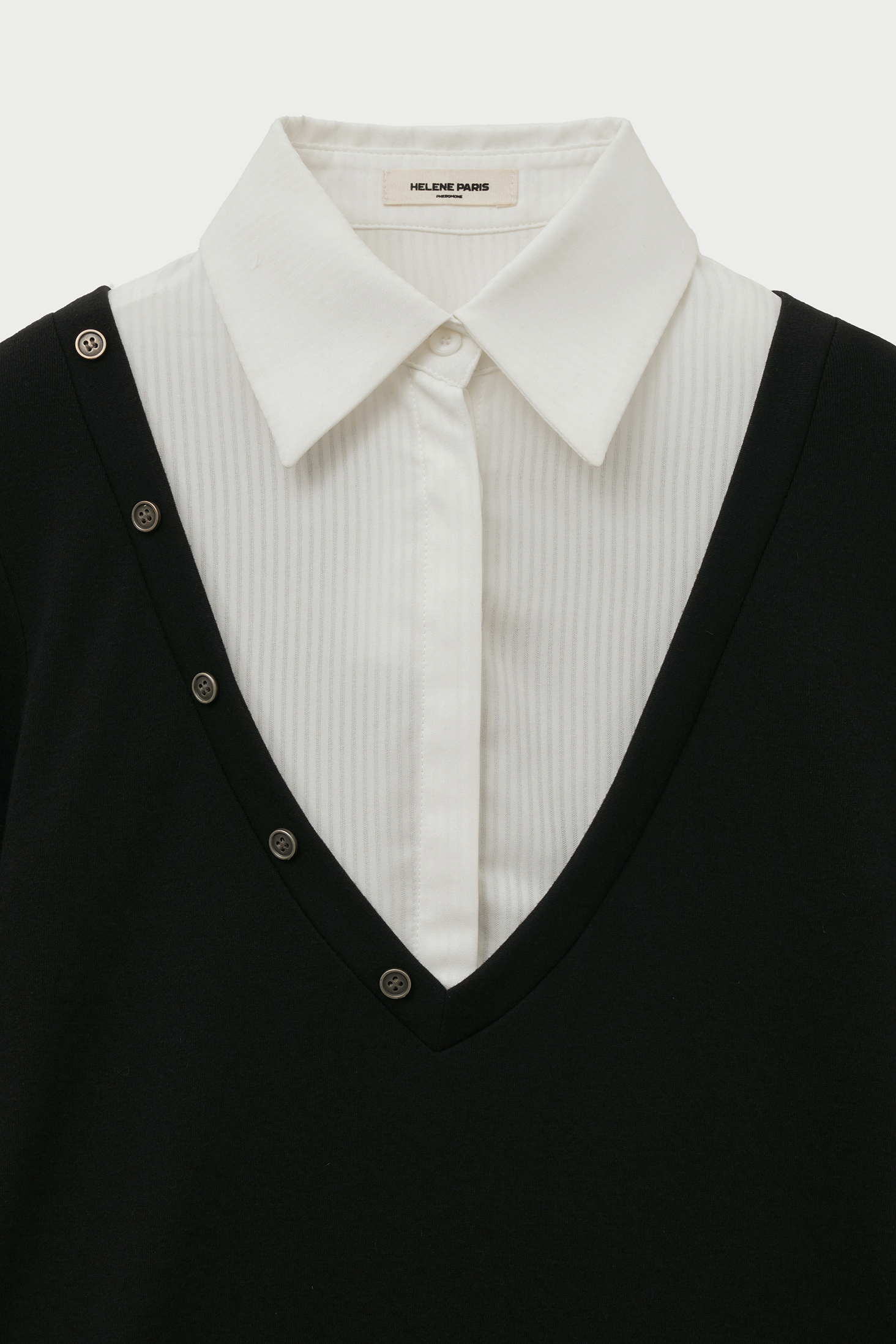 - 셔츠와 브이넥 티셔츠를 함께 레이어드하여 입은 듯한 일체형 가먼트입니다.