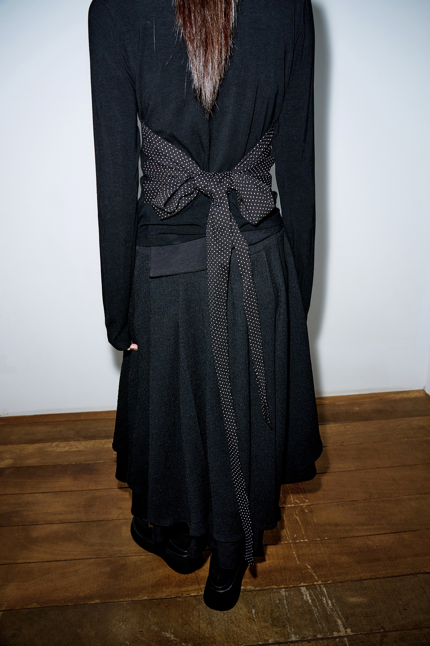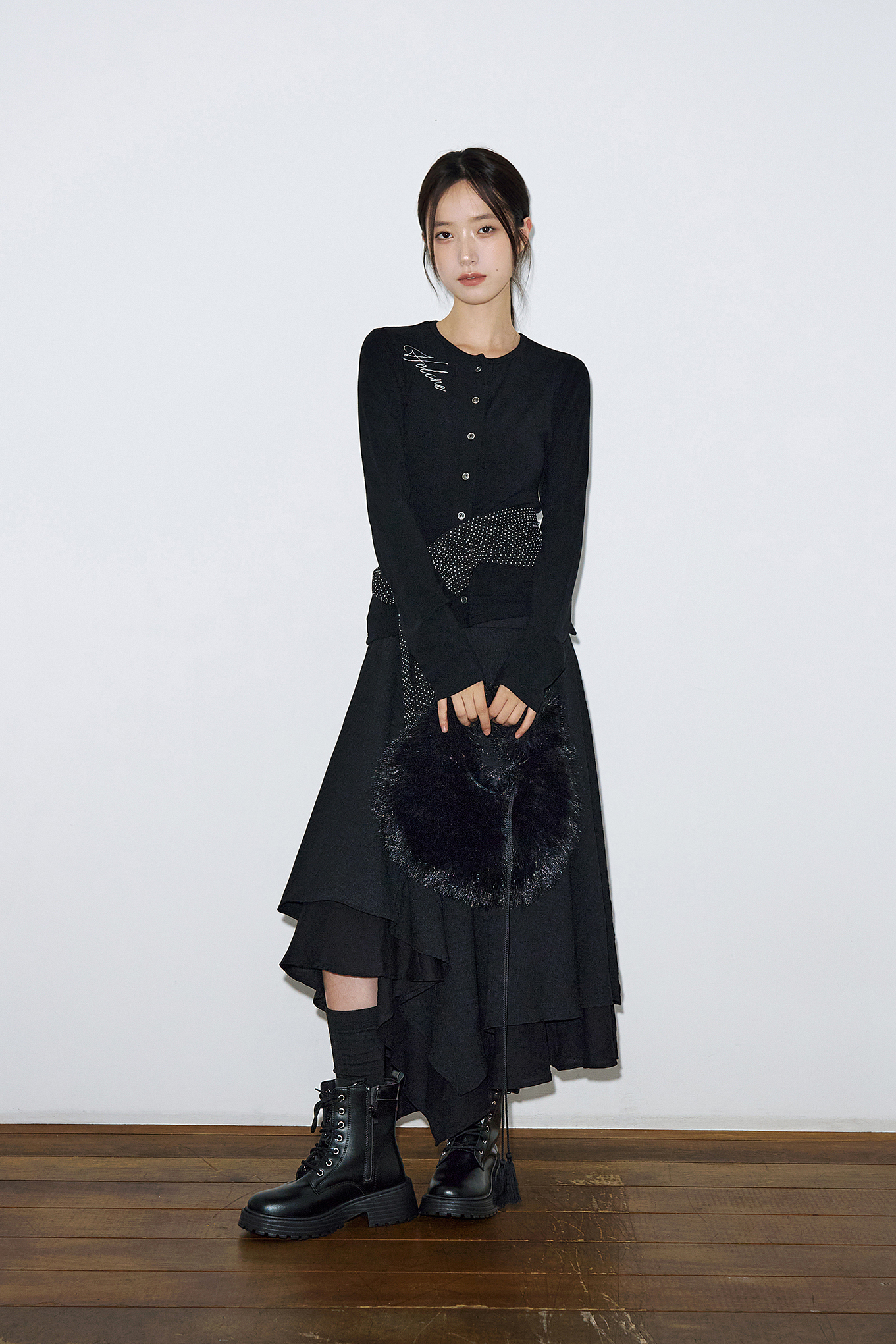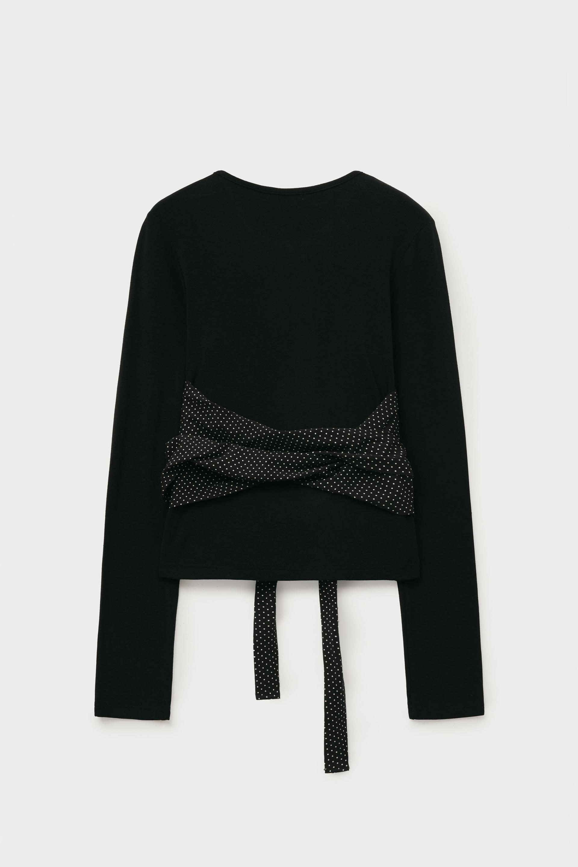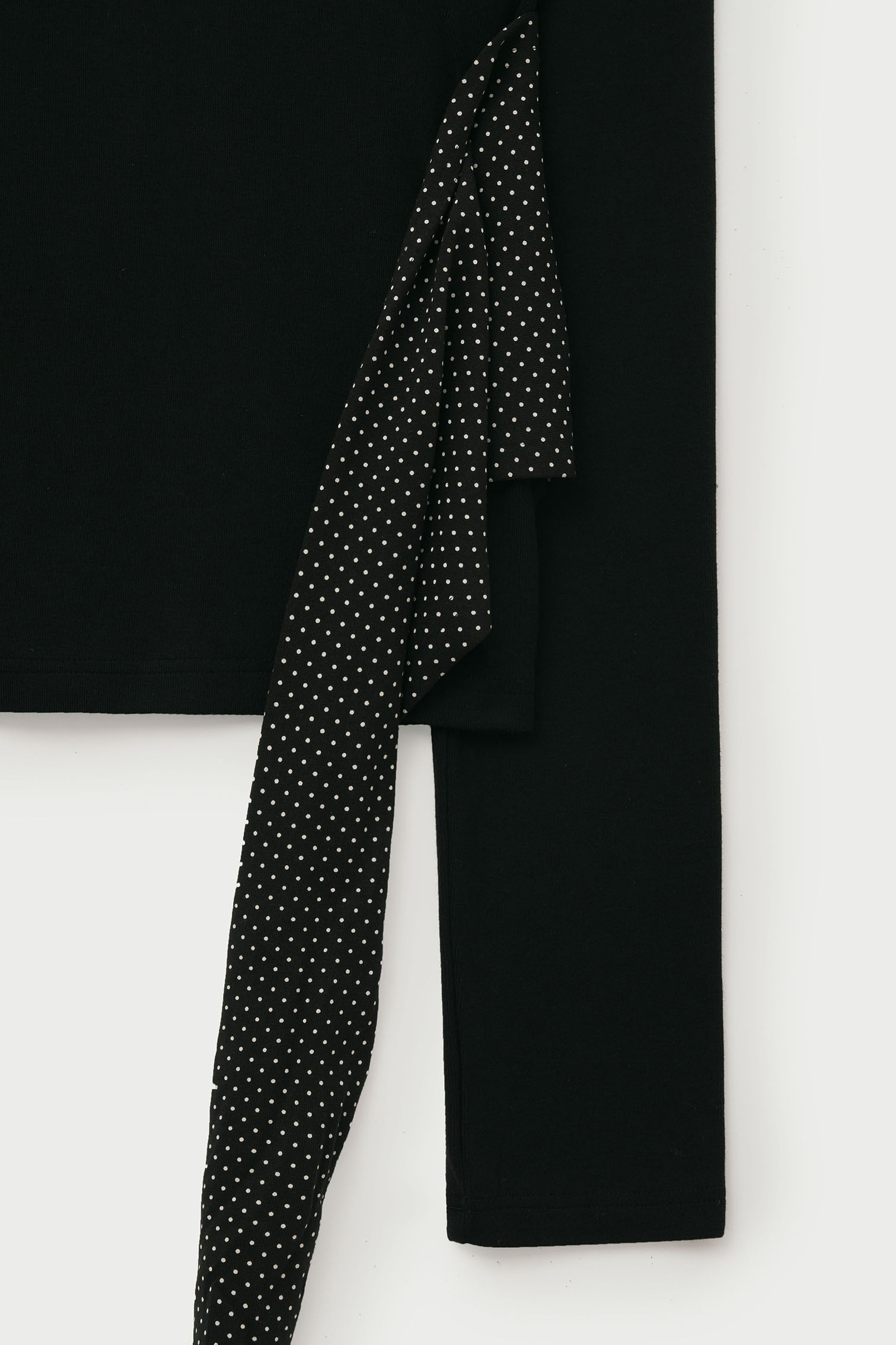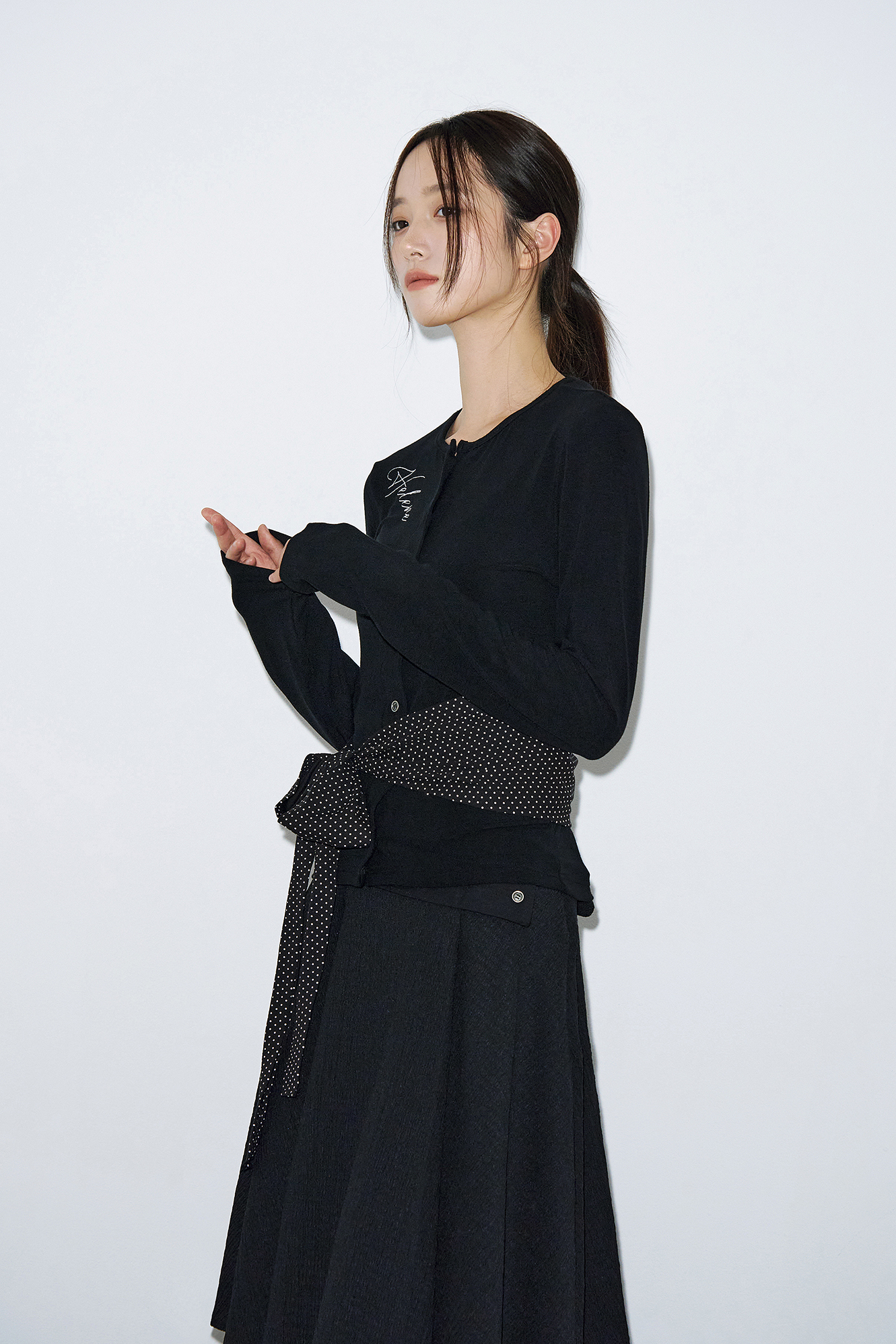 - 도트 패턴과 블랙 솔리드 컬러가 배색된 웨이스트 라인 타이가 포인트입니다.