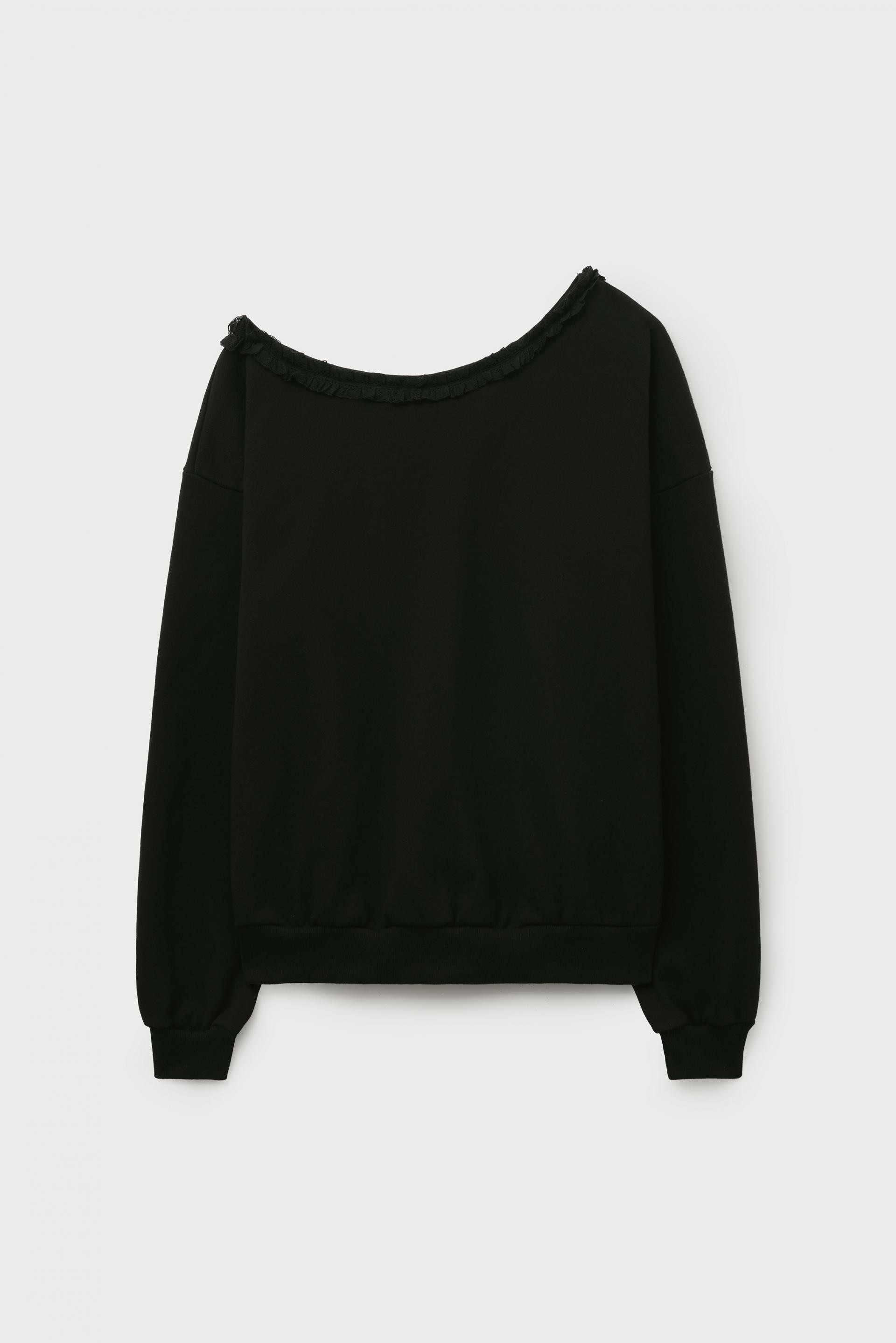 - 넥 라인 프릴 레이스와 로고 큐빅 디테일이 더해진 원 숄더 스웨트셔츠입니다.