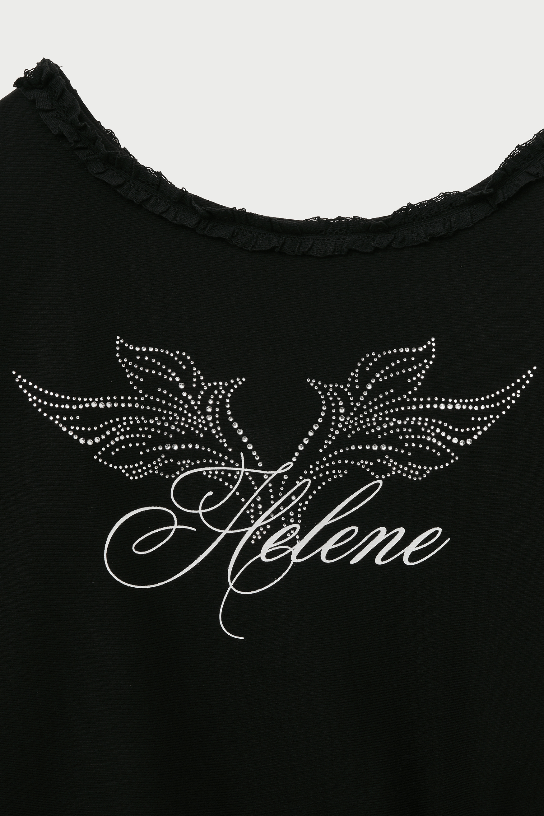- 화이트 헬레네 로고 프린팅과 엔젤 큐빅이 블랙 컬러와 대비되며 포인트를 더해줍니다.