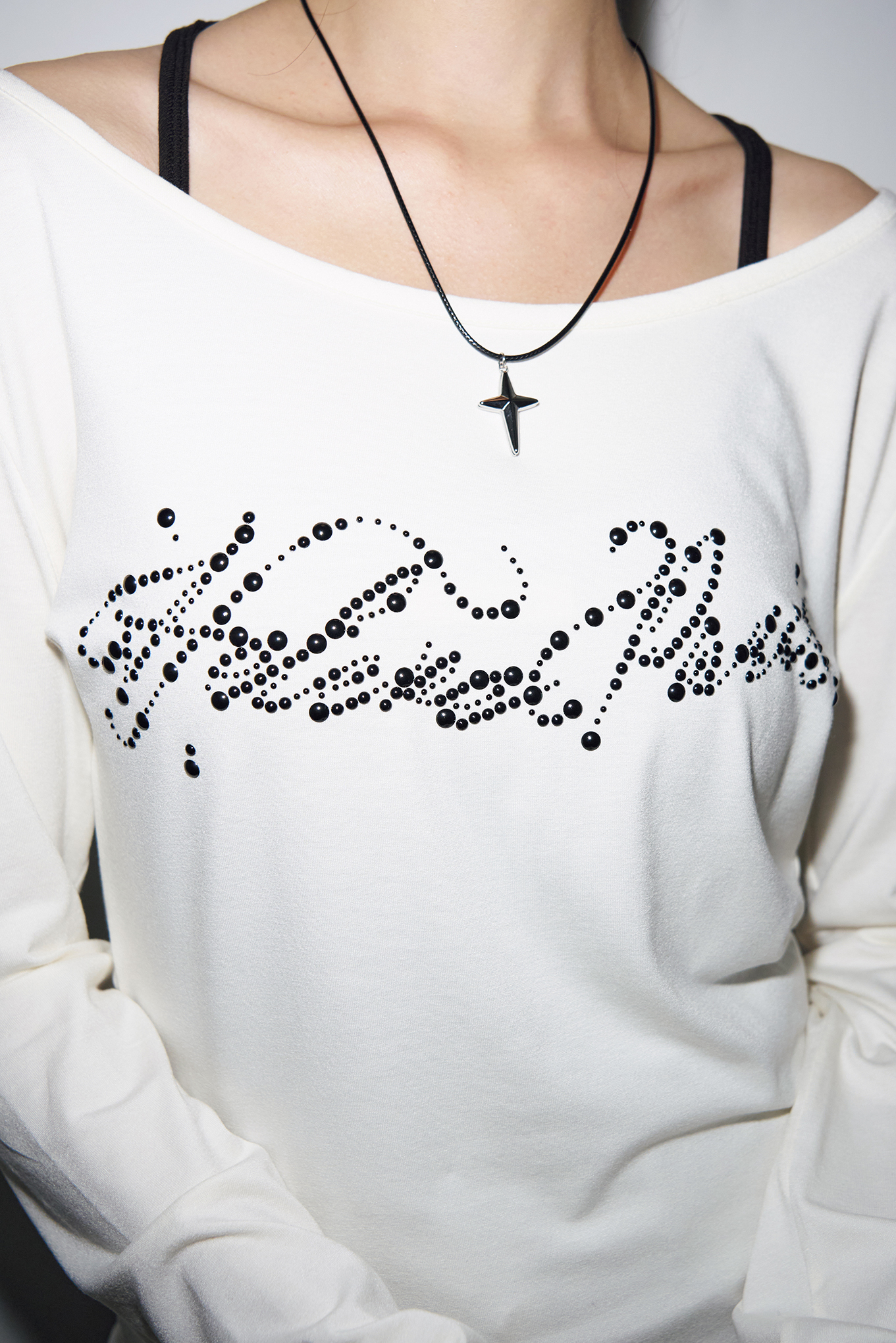 - 블랙 돔 스터드로 이루어진 웨이브 레터링 로고가 돋보입니다.