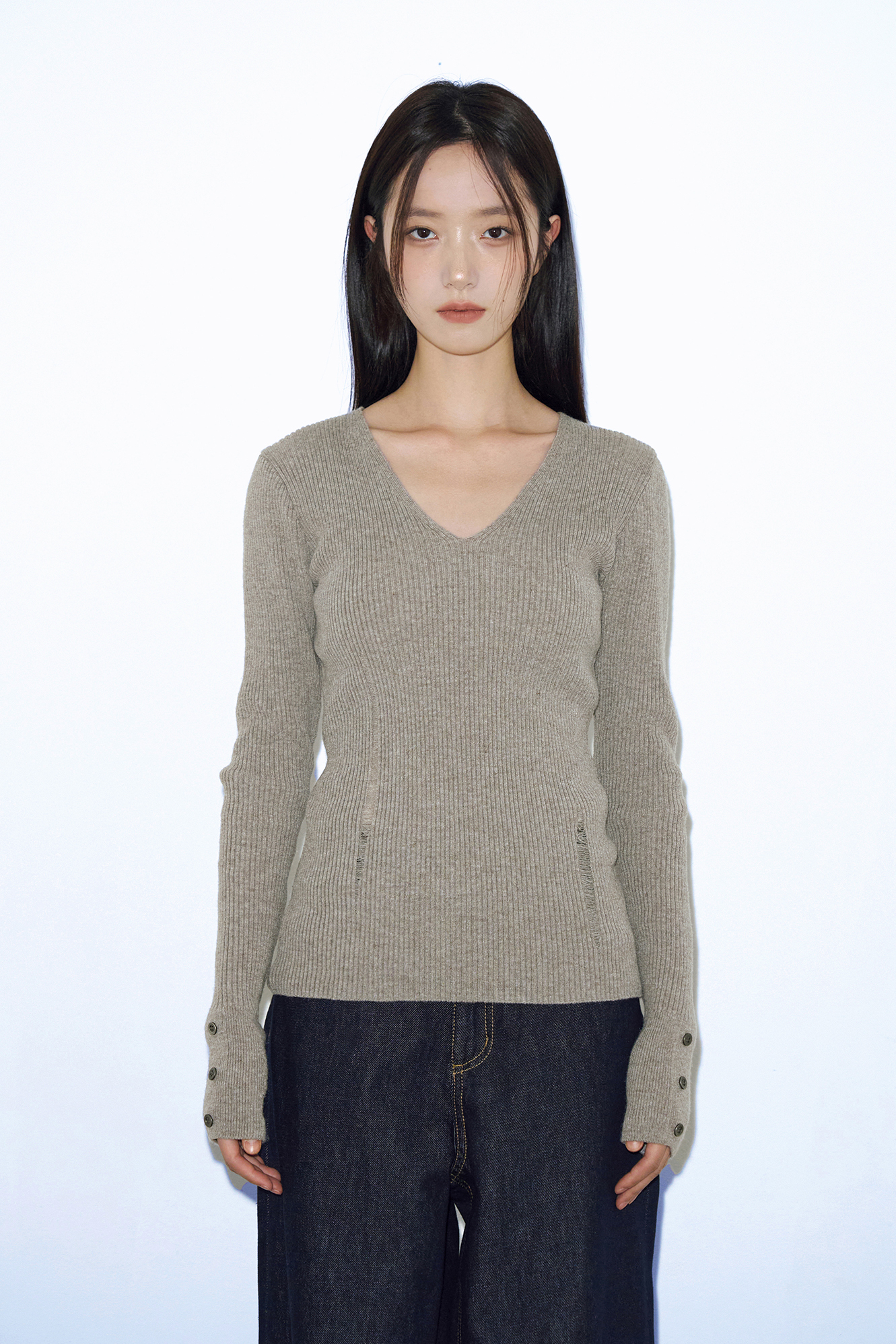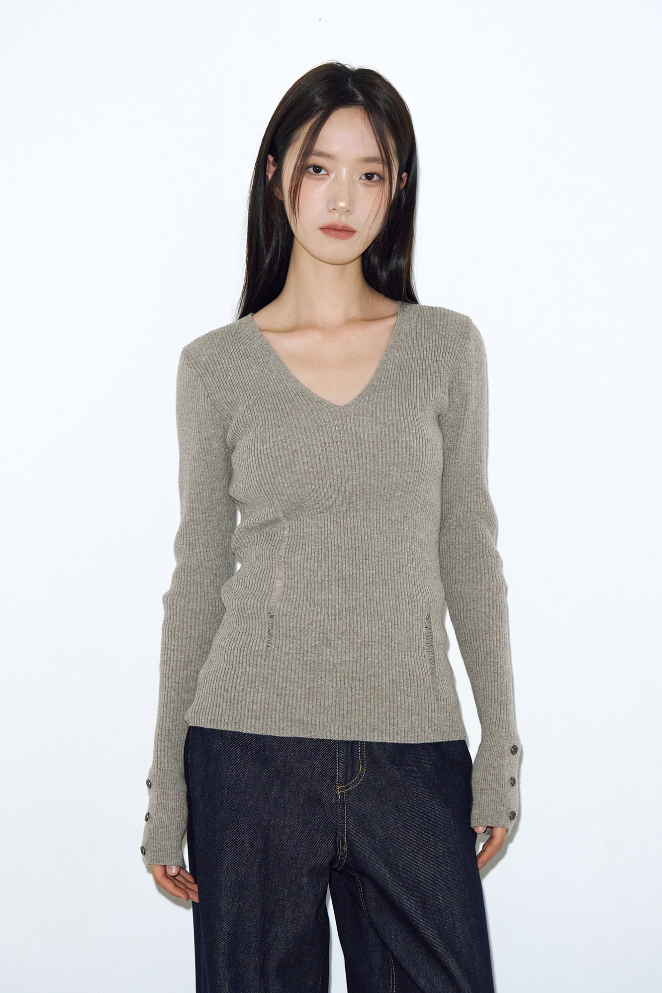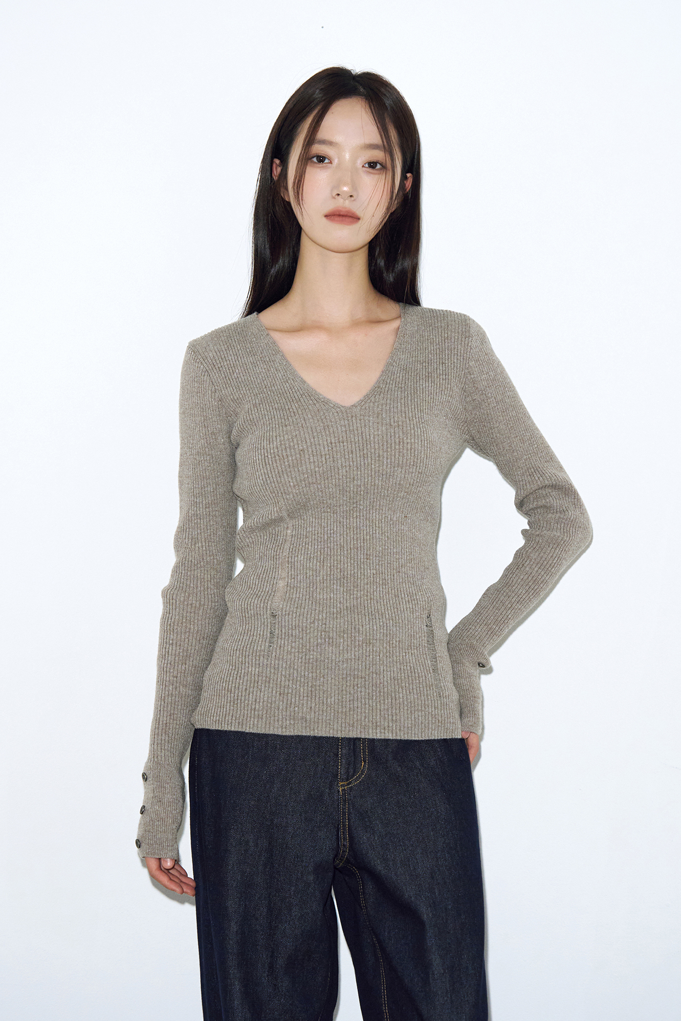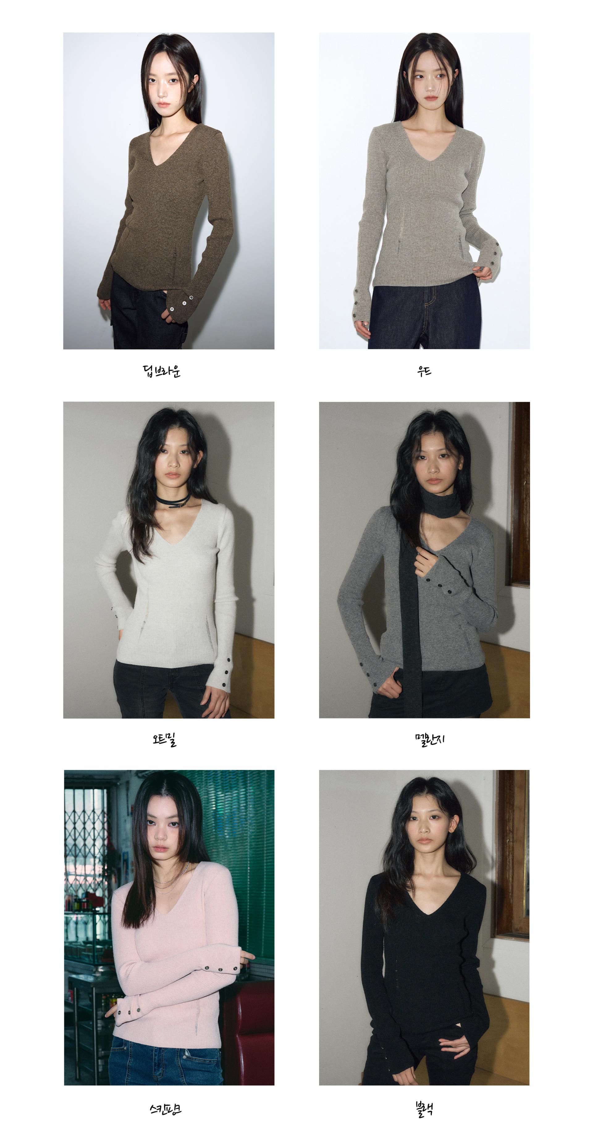 - 깊지 않은 V넥 디자인으로 넥 라인을 자연스럽게 드러낼 수 있으며, 잔잔한 립 조직으로 볼륨감 있으면서도 슬림한 바디 라인 실루엣을 완성합니다.