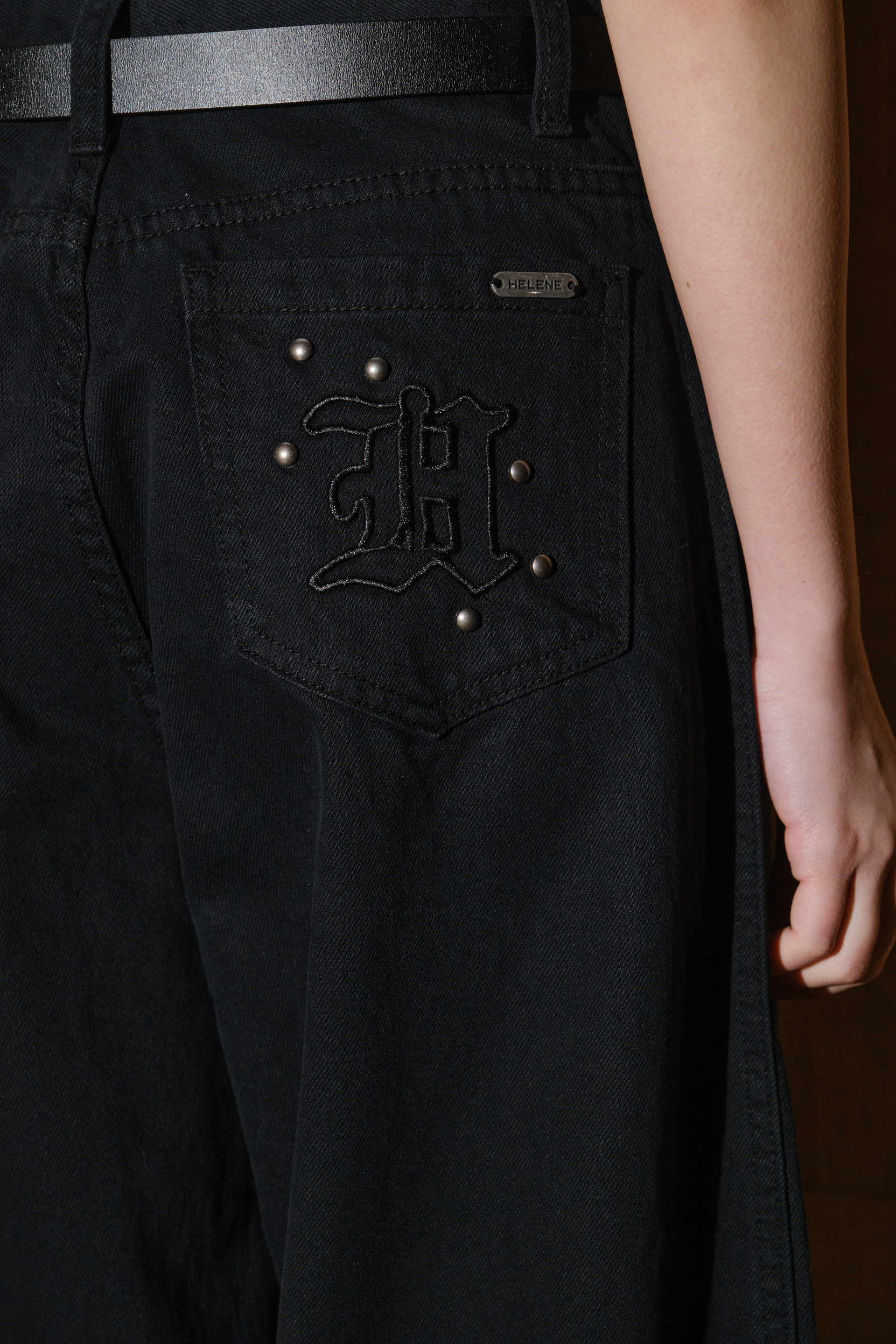 - 백 포켓 H 로고 자수에 앤틱한 스터드와 헬레네 그레이버 디테일을 더했습니다.